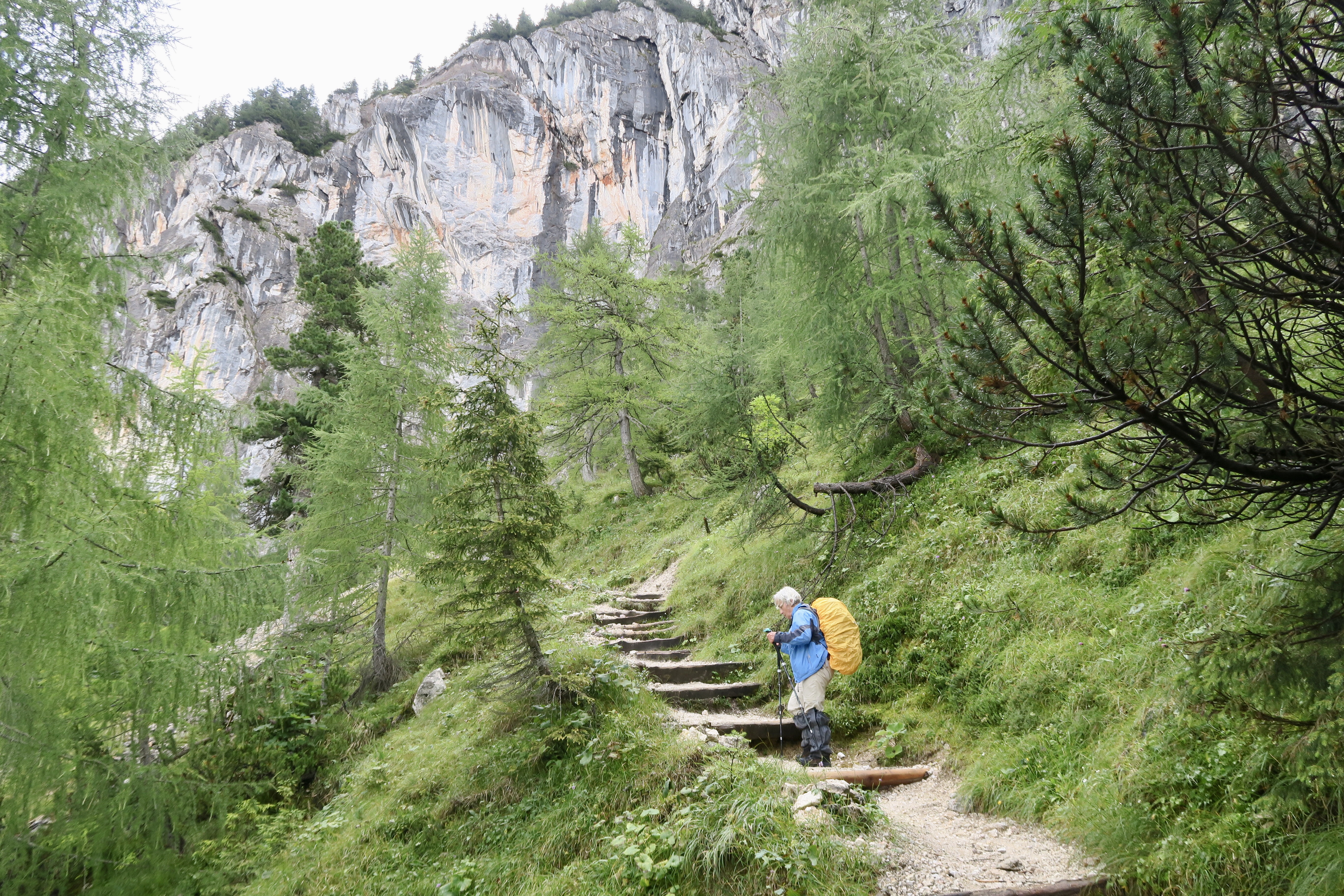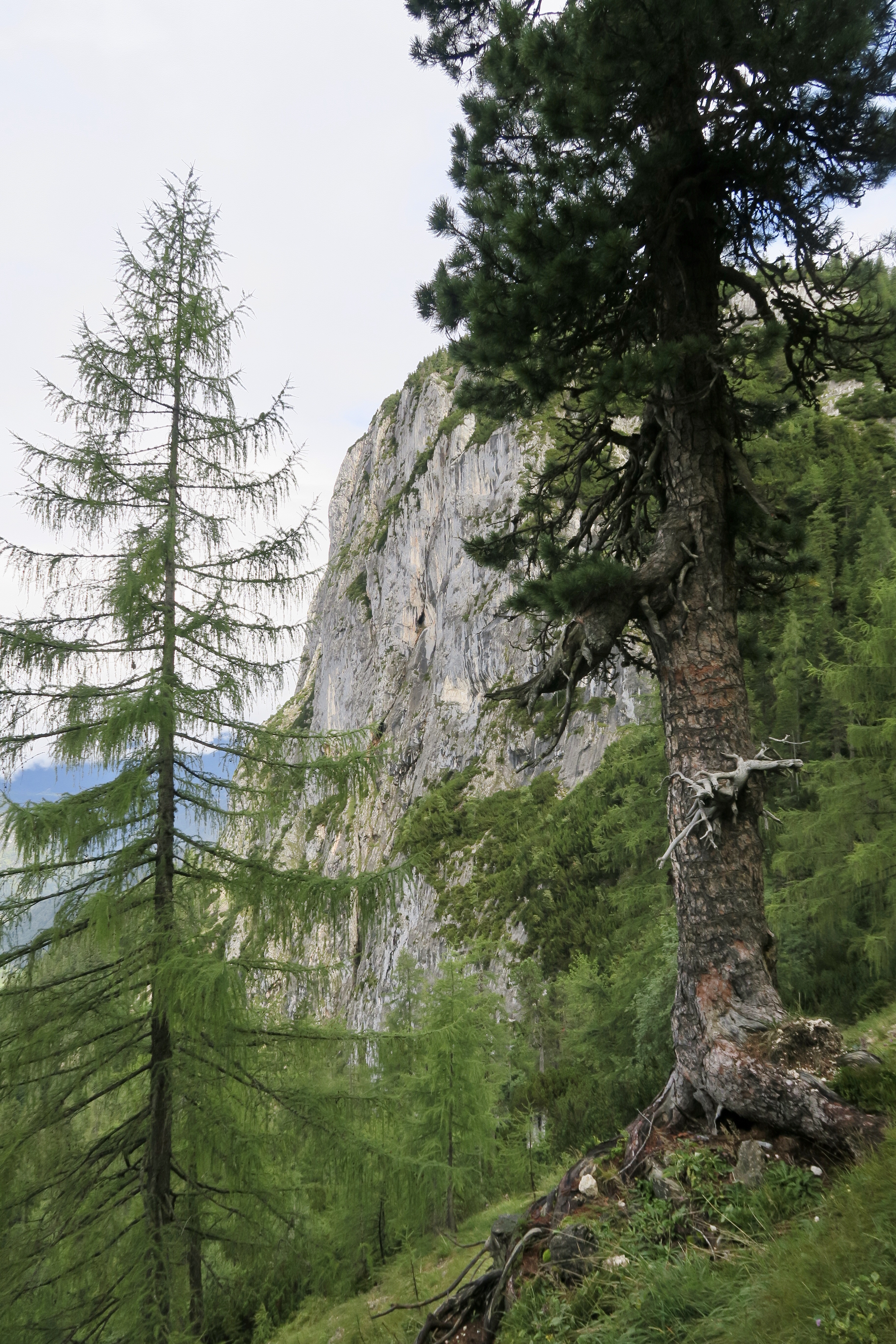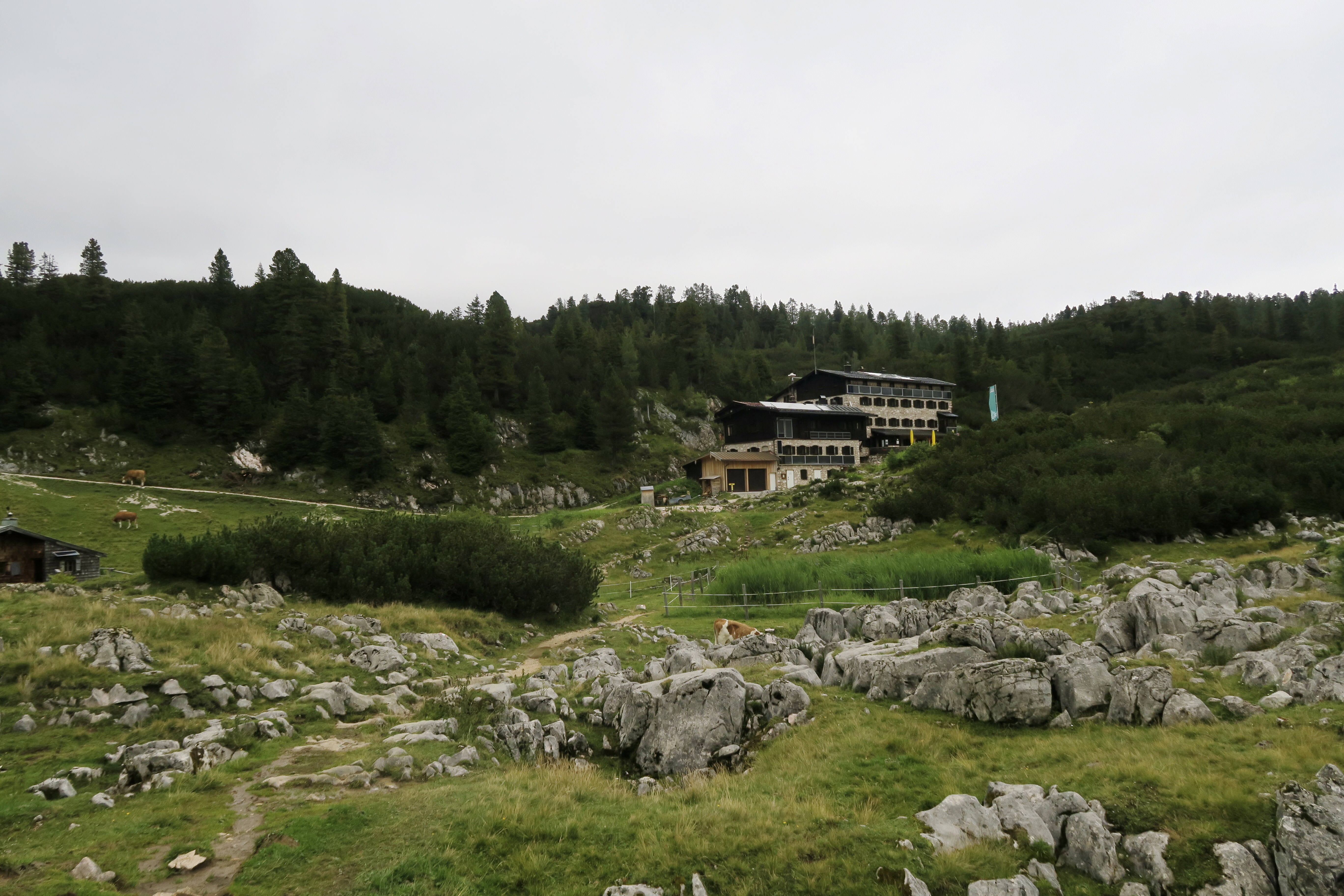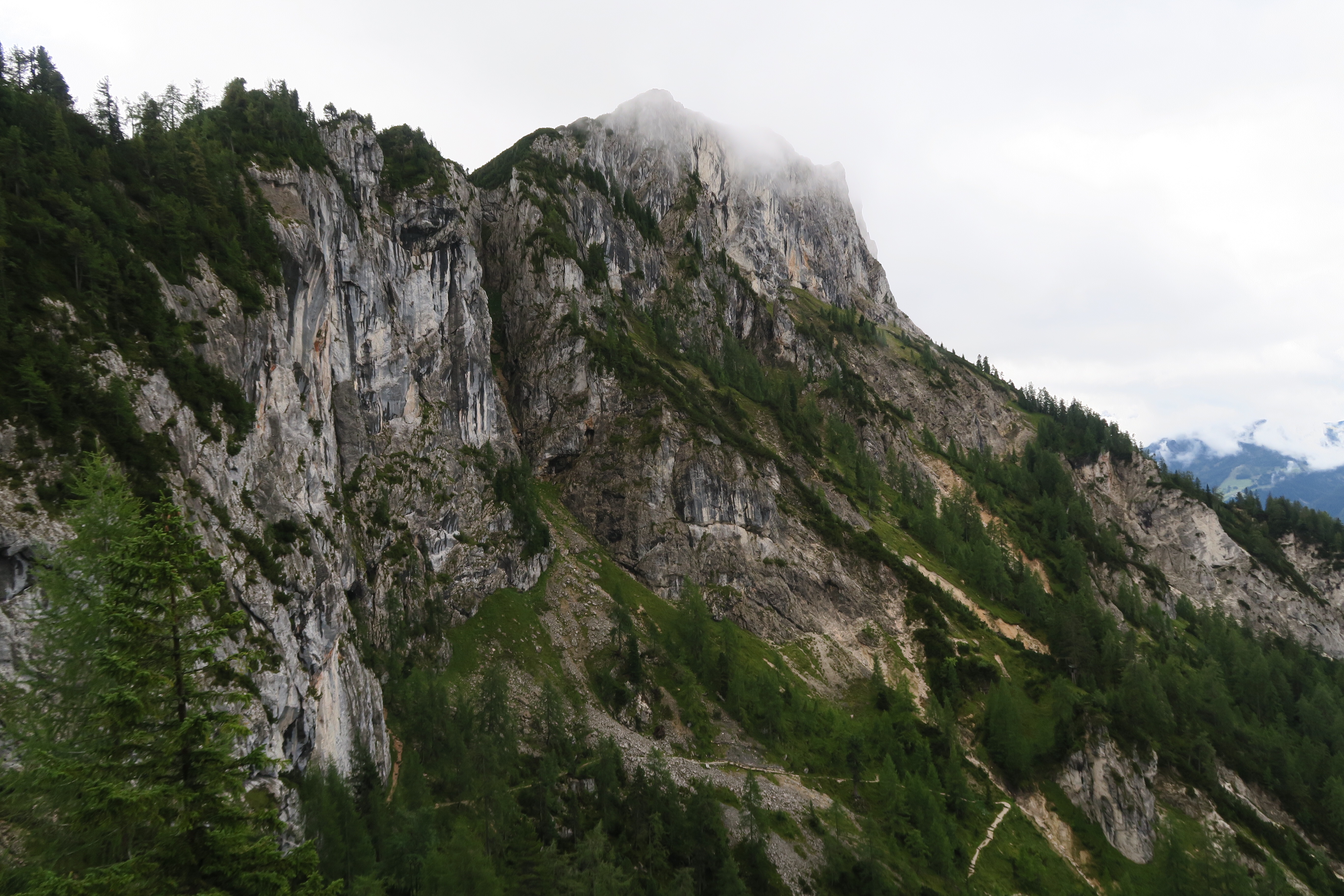 Notre première randonnée part de Ramsau et le sentier est bien raide mais magnifique. Nous sommes sous la protection d’un énorme mur de rocher „Wartstein“ et le sentier nous amène à presque 1000 m plus haut sur la Neue Traunsteiner Hütte. Un arc un ciel et un chamois nous surprennent.