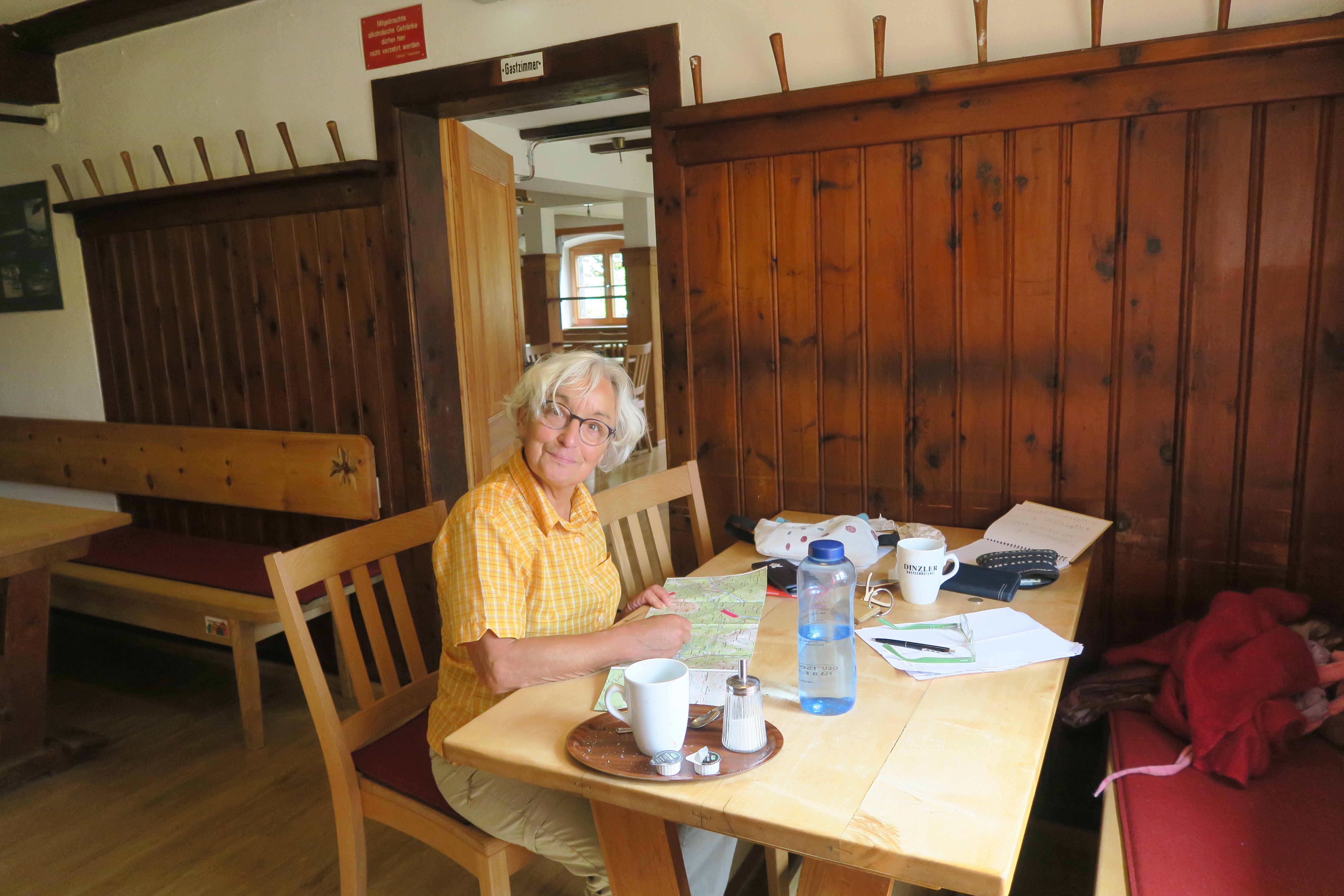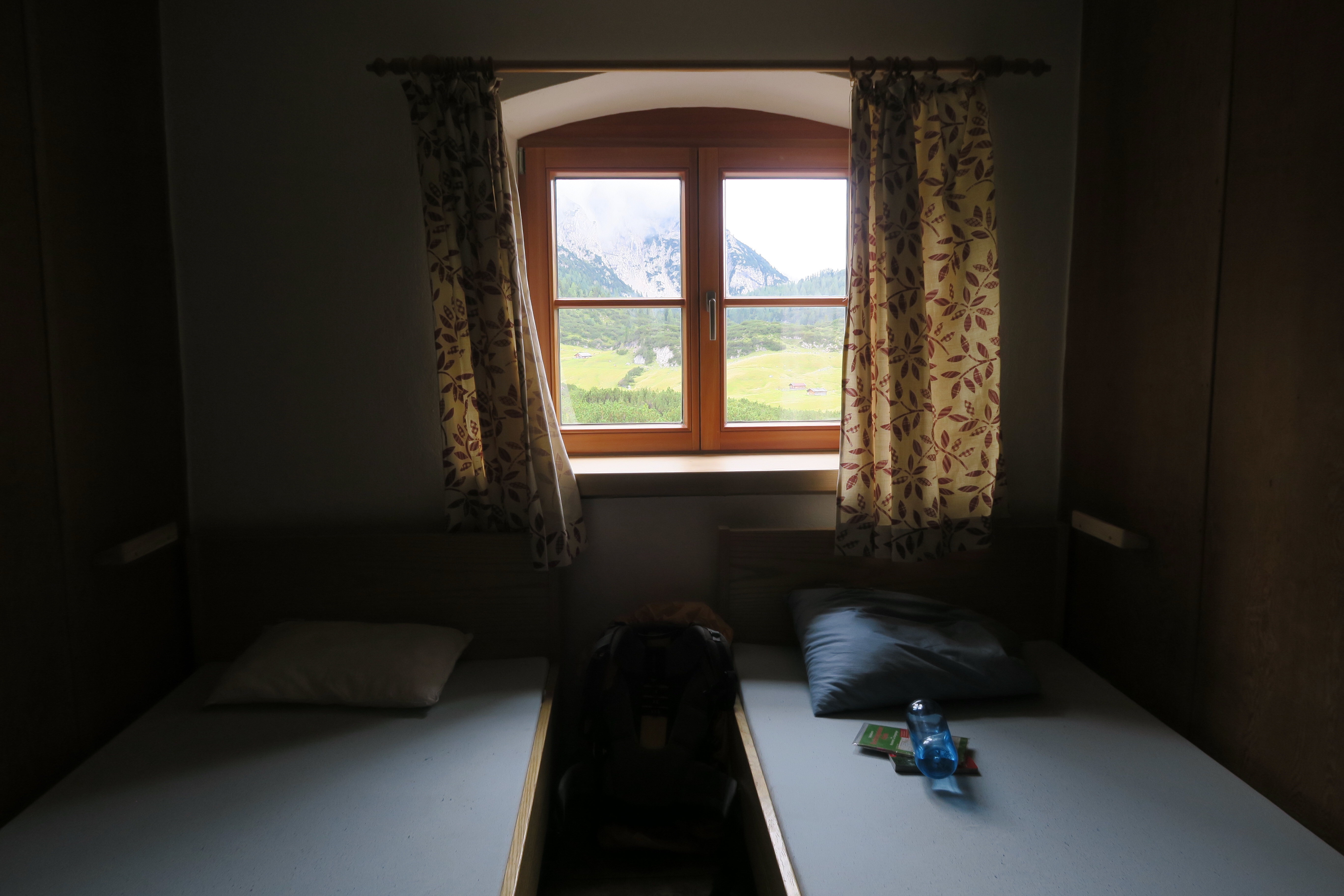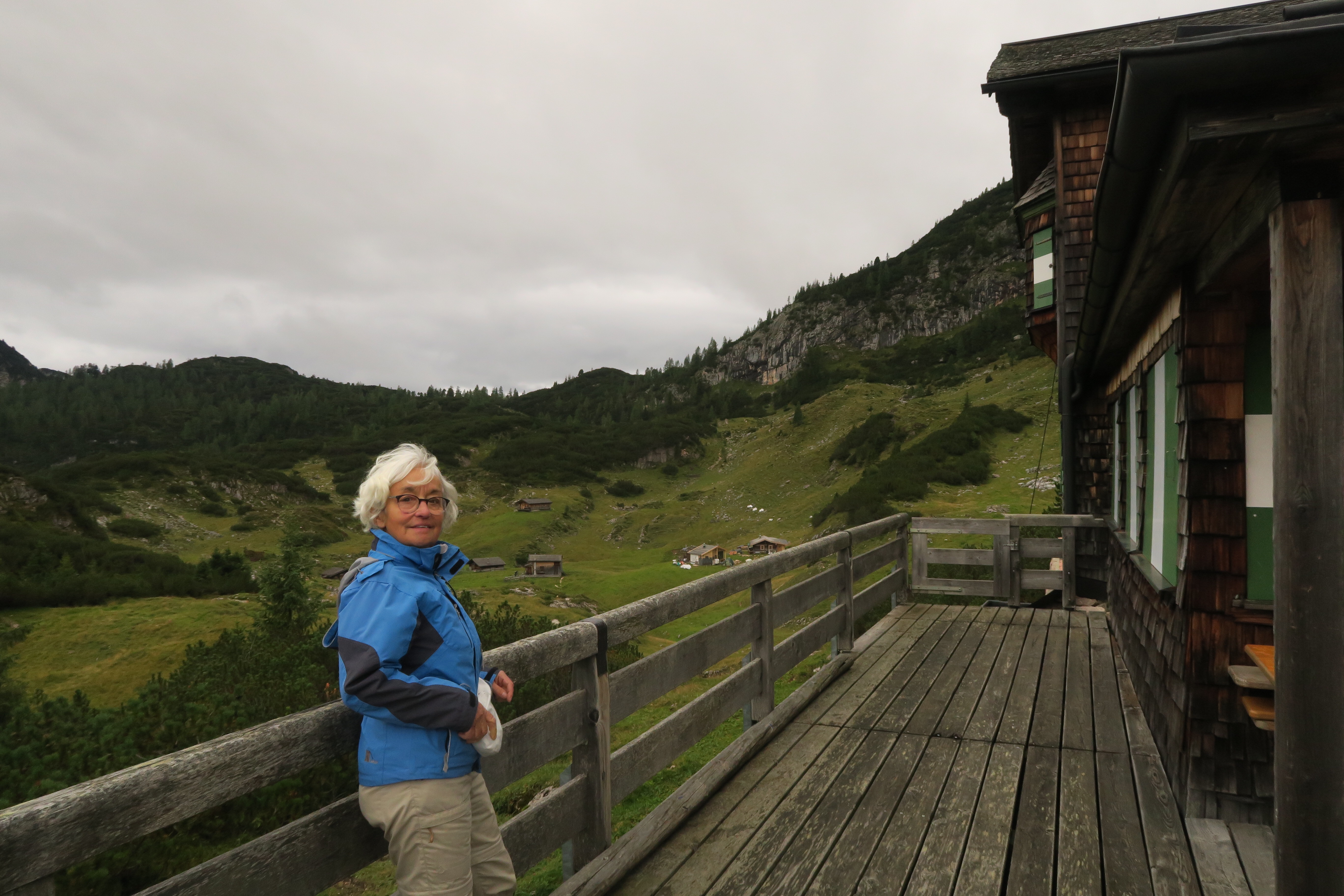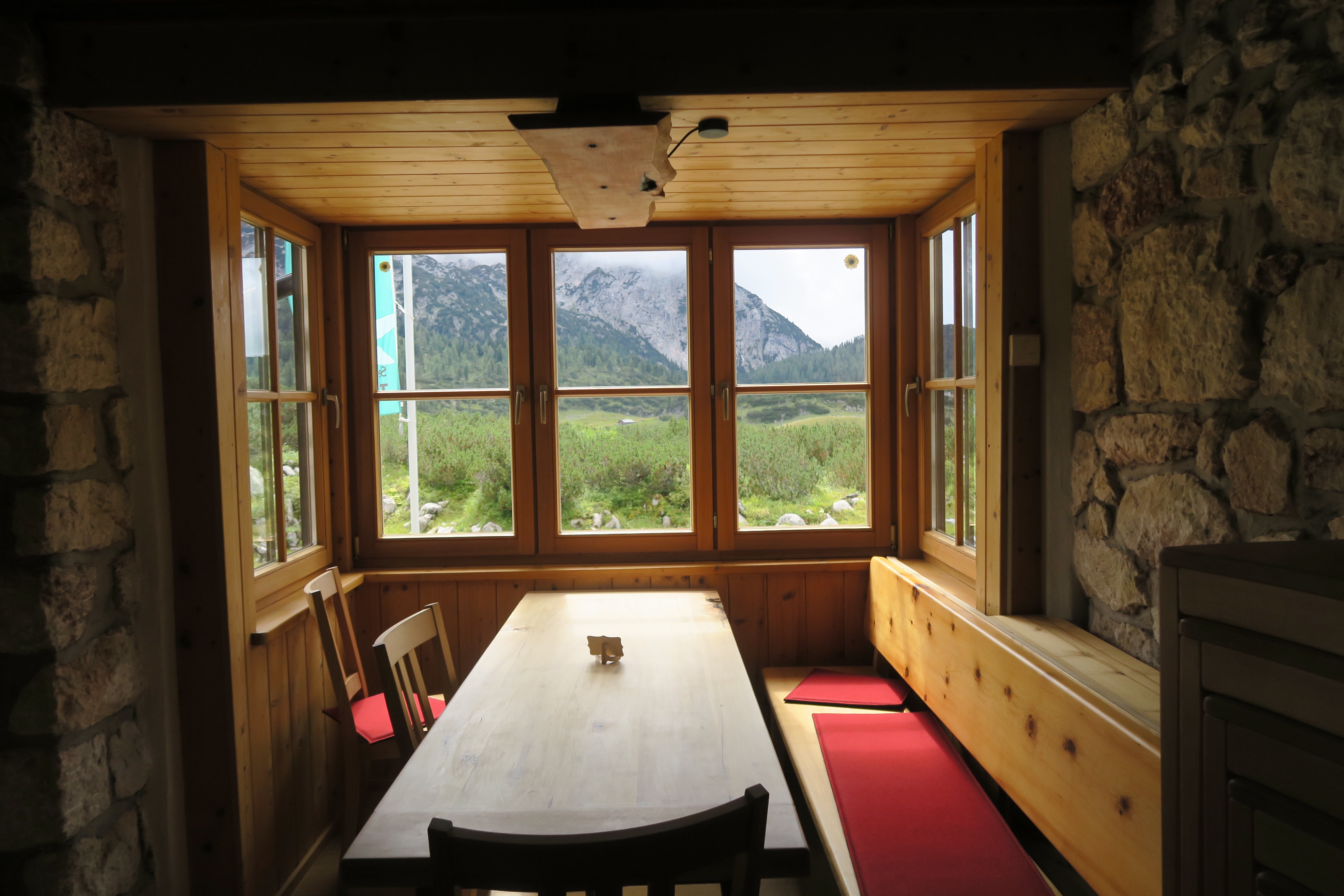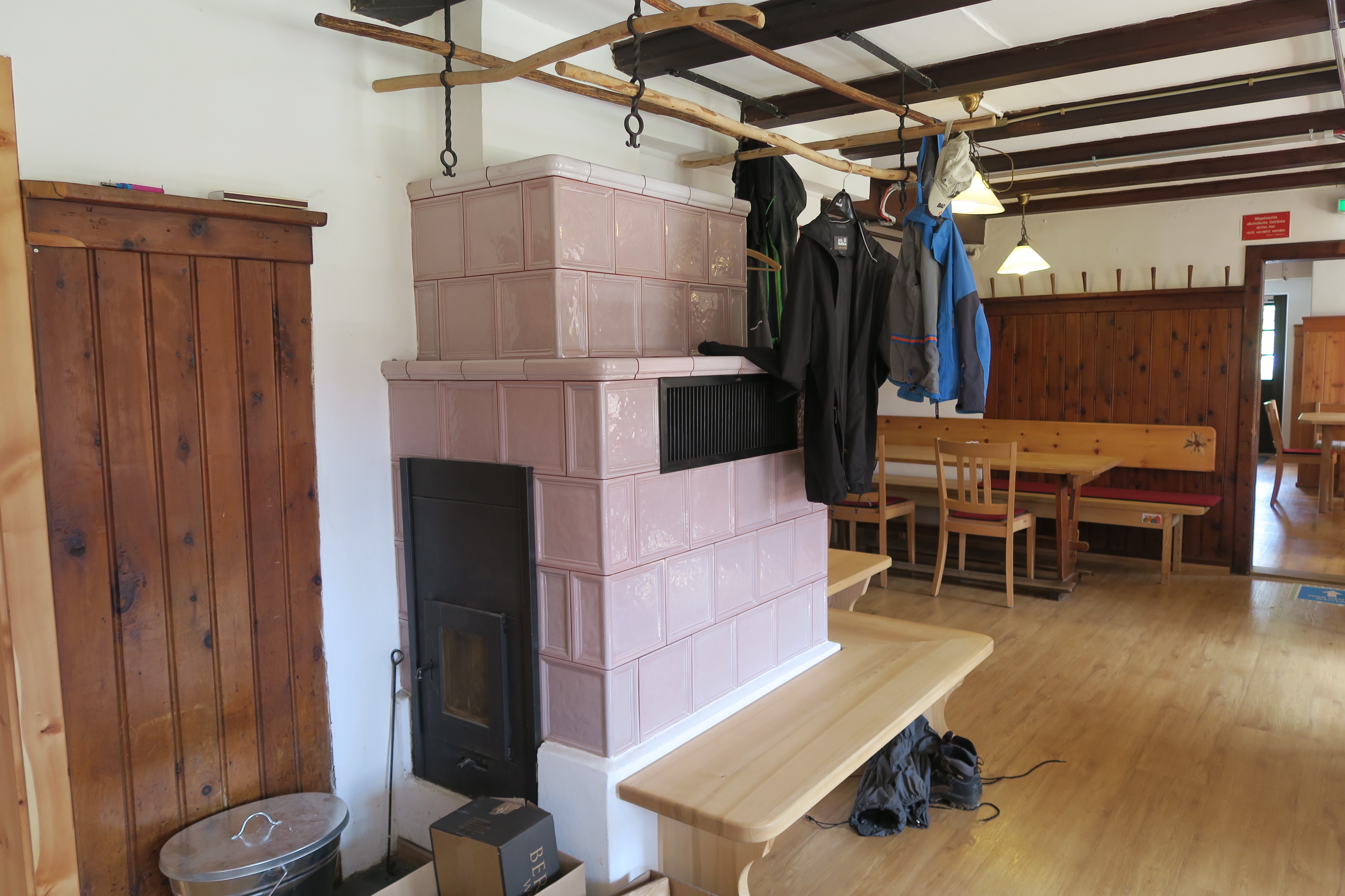 Nous adorons des randonnées de refuge en refuge. Mais je dois expliquer un peu, ce que un refuge dans les Alpes côté allemand ou autrichien. Aujourd’hui cela ressemble plutôt à un gîte, une auberge, donc des bons repas, de la bonne bière, un intérieur en bois, typique pour la région, un chauffage traditionnel, Kachelofen, des installations à la pointe du progrès en écologie, seulement pour le coucher, on trouve des dortoires mais aussi quelques chambres. L’approvisionnement se passe souvent par monte-charge ou hélicoptères, car la plupart des refuges sont perdus dans les montagnes. Voici des photos pour illustrer mes propos: