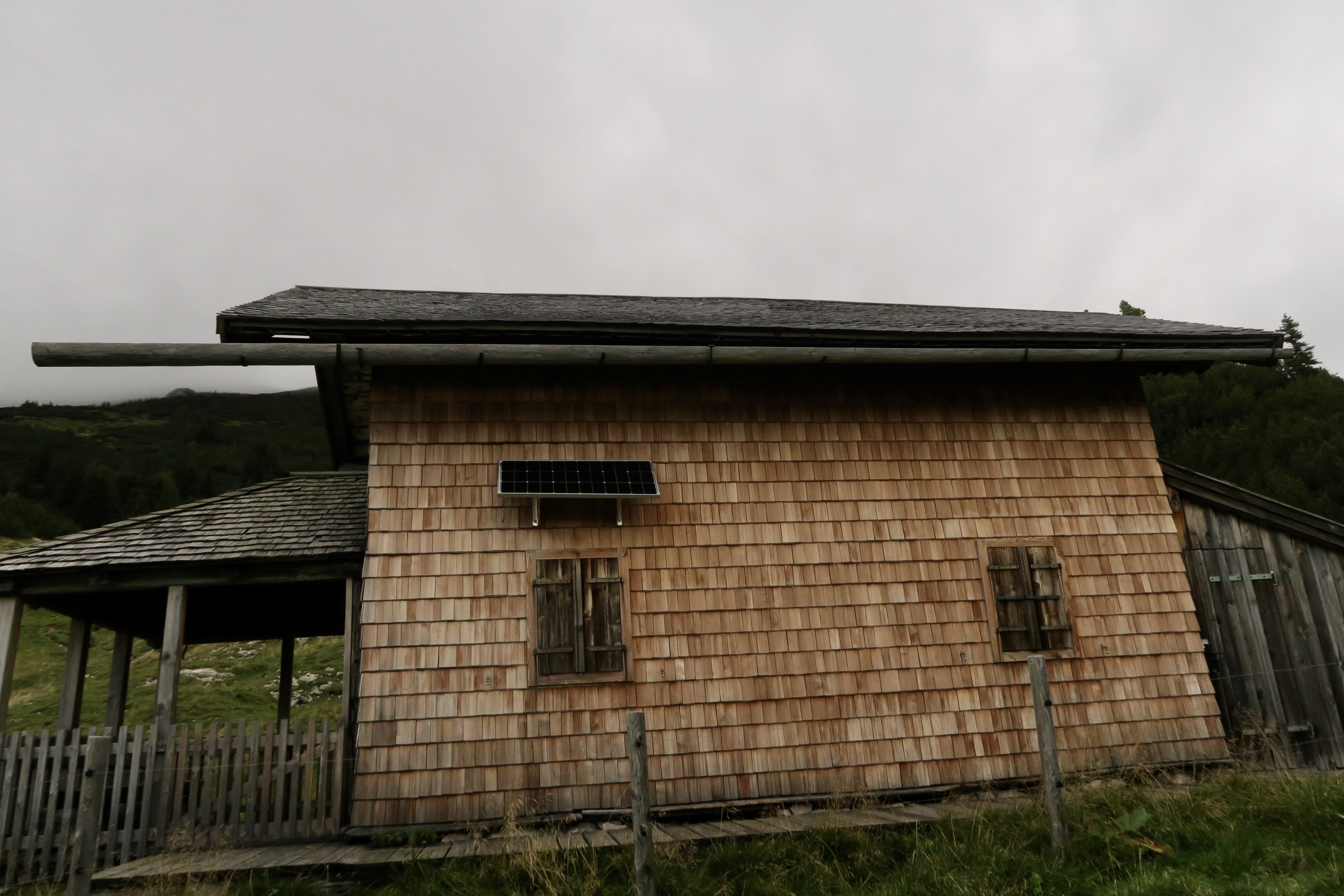 Il y a des alpages, des vaches et des belles granges typiques autour de notre Hütte. Malgré le mauvais temps on voit quand même de beau paysages et cette maison toute en bois: le toit, les gouttières, les murs.