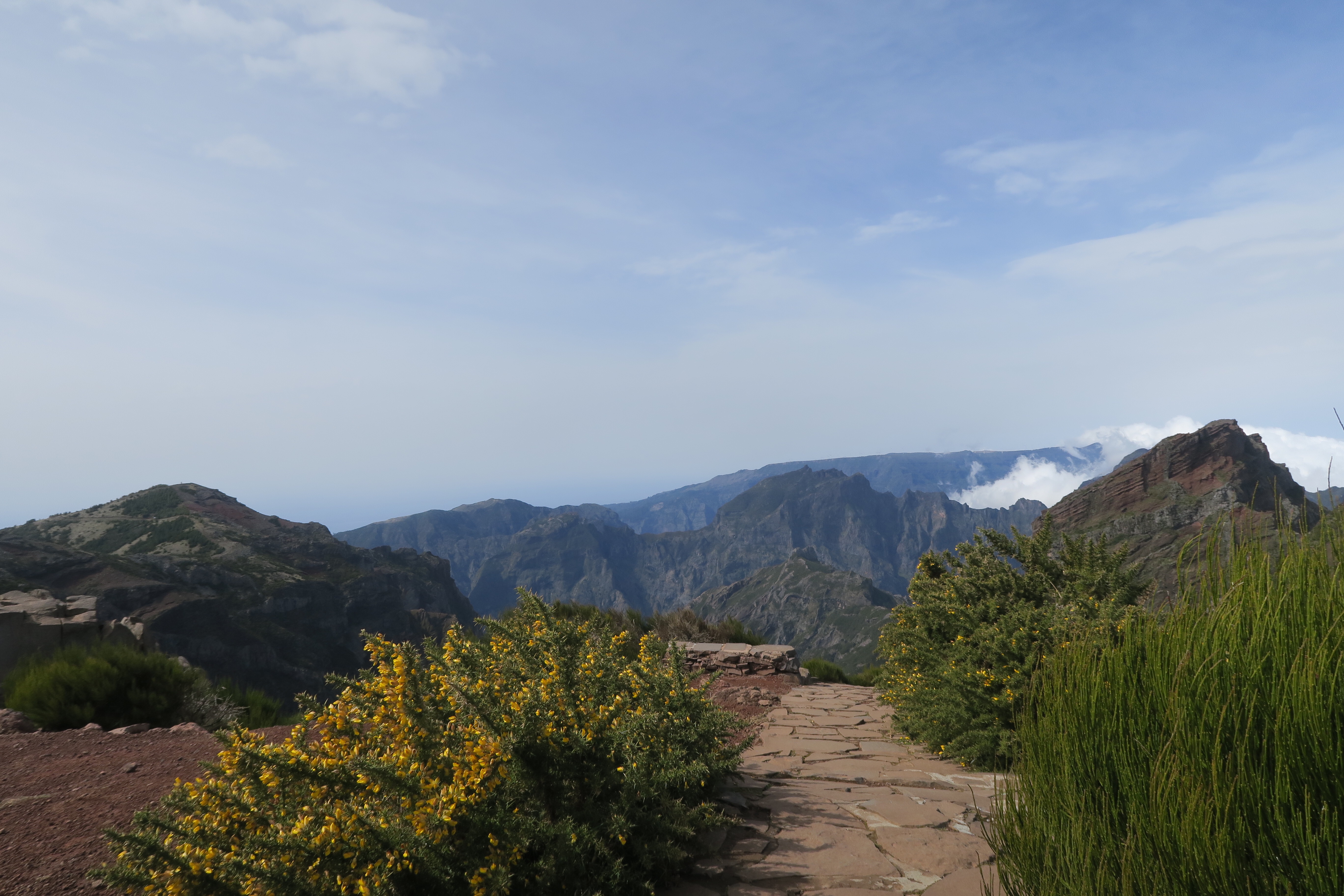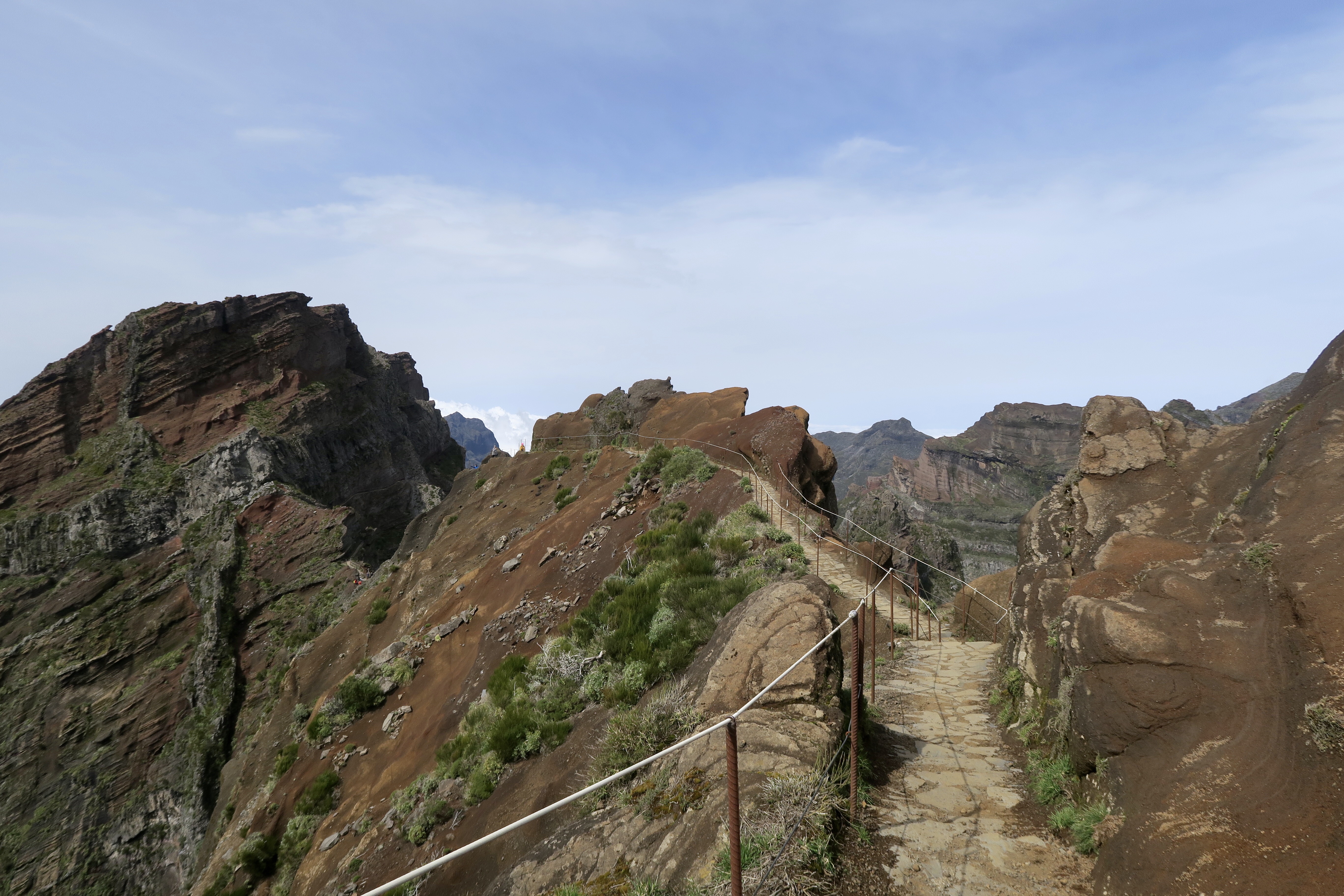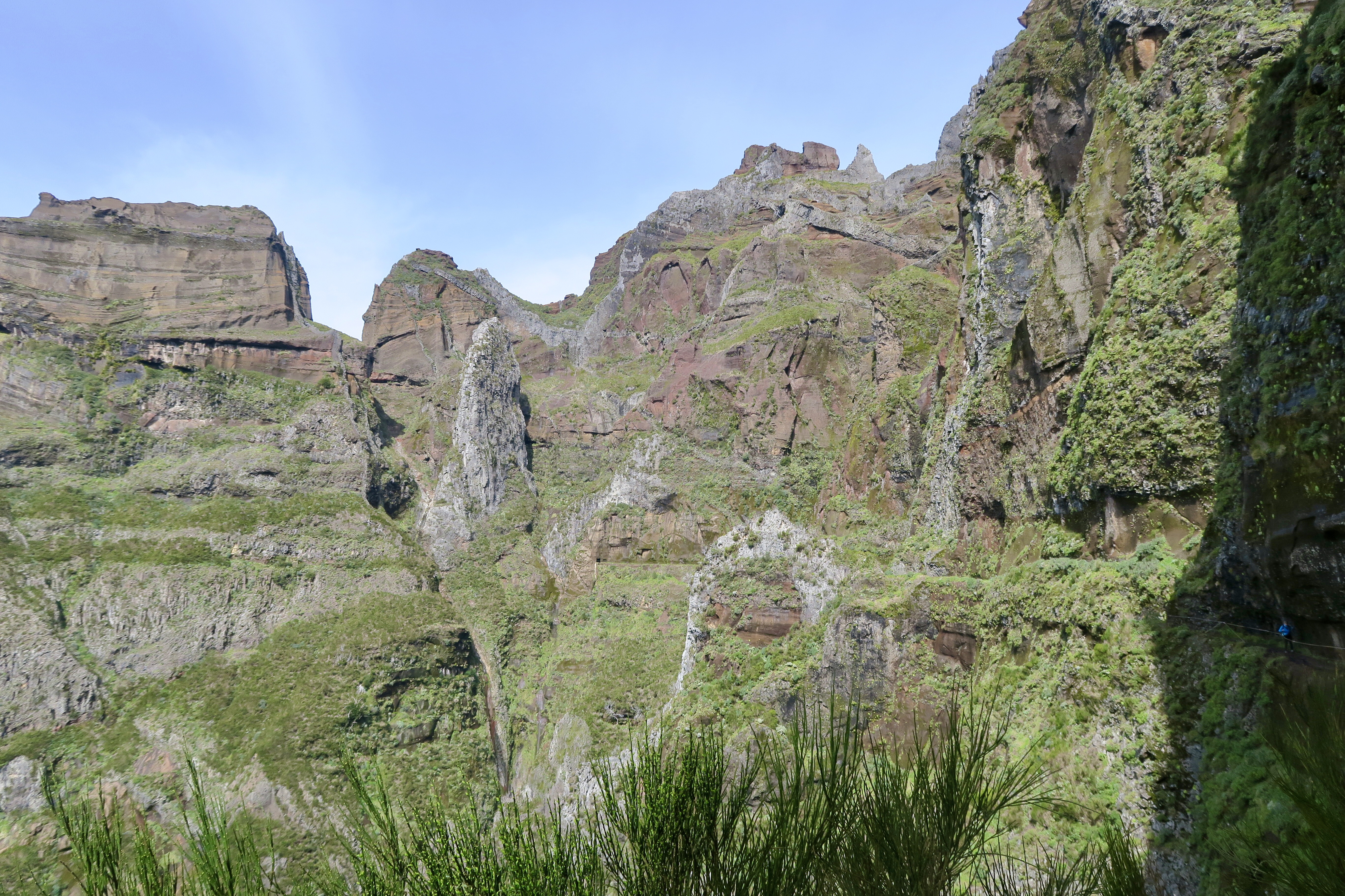 Je parlerai d’abord de ma plus belle randonnée et peut être aussi de la plus exigeante: c’est du Pico Ruivo, la plus haute montagne avec ses 1862 m au Pico Arriero 1818 m aller et retour, ce qui fait 6 heures de marche sans pause et surtout un dénivelé sans pareil, et j’ai fait 20 km dans la journée et 8 heures sur les jambes, mais quelle bonheur! Un paysage à couper le souffle, des montées raides, des escaliers en fer, des tunnels, des chemins abrupts et finalement beaucoup de monde. Au début je partais seule, je me suis même posée la question si je n’allais pas avertir quelqu’un en cas d’accident. Mais très vite, j’ai croisé du monde ( la plus part des gens font la rando à l’envers), et au moins je n’étais pas seule. Par moment le vent était si fort qu’il fallait se cramponner à ses bâtons, mais la grande chance était que ce jour là il a fait beau! Et voici quelques photos