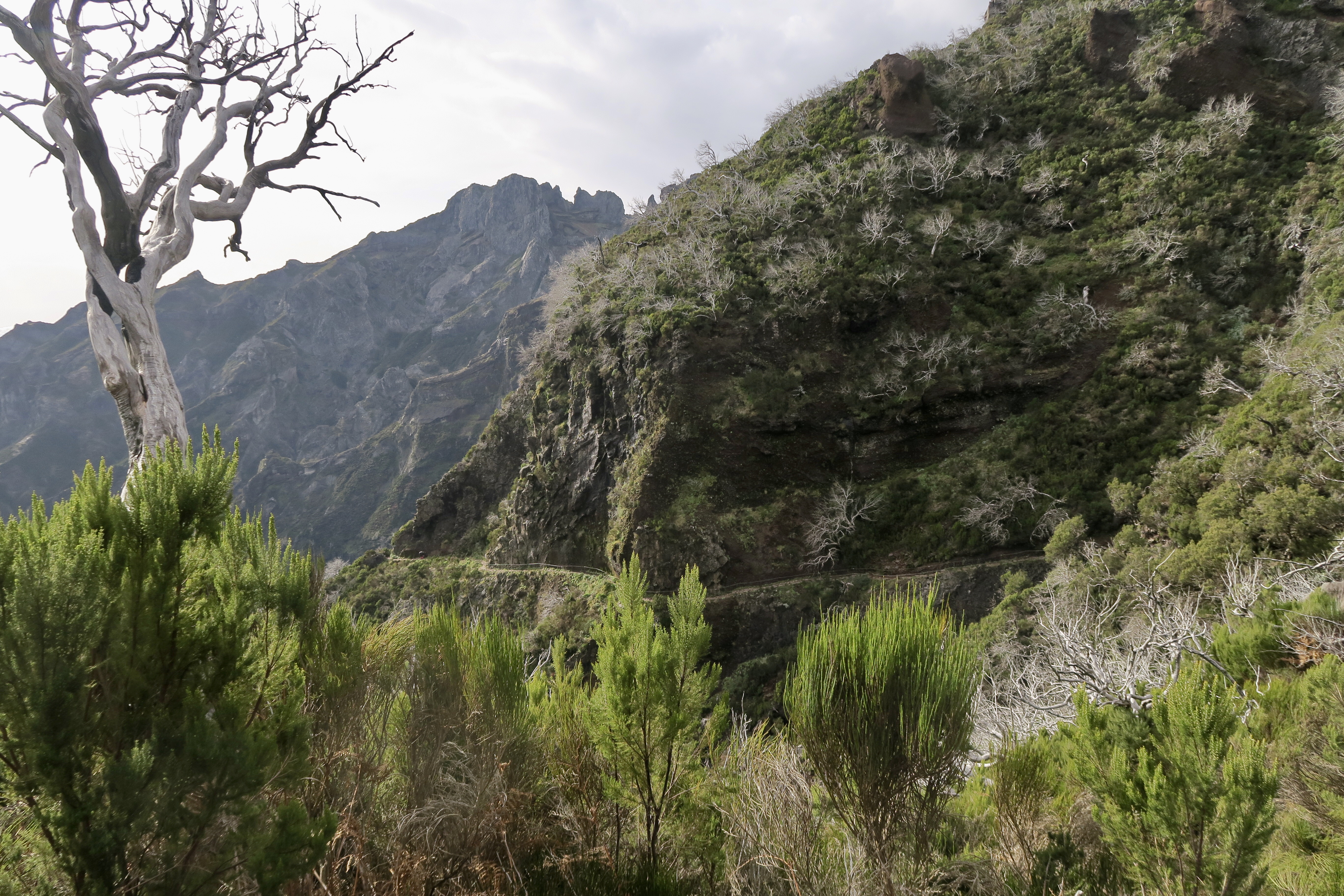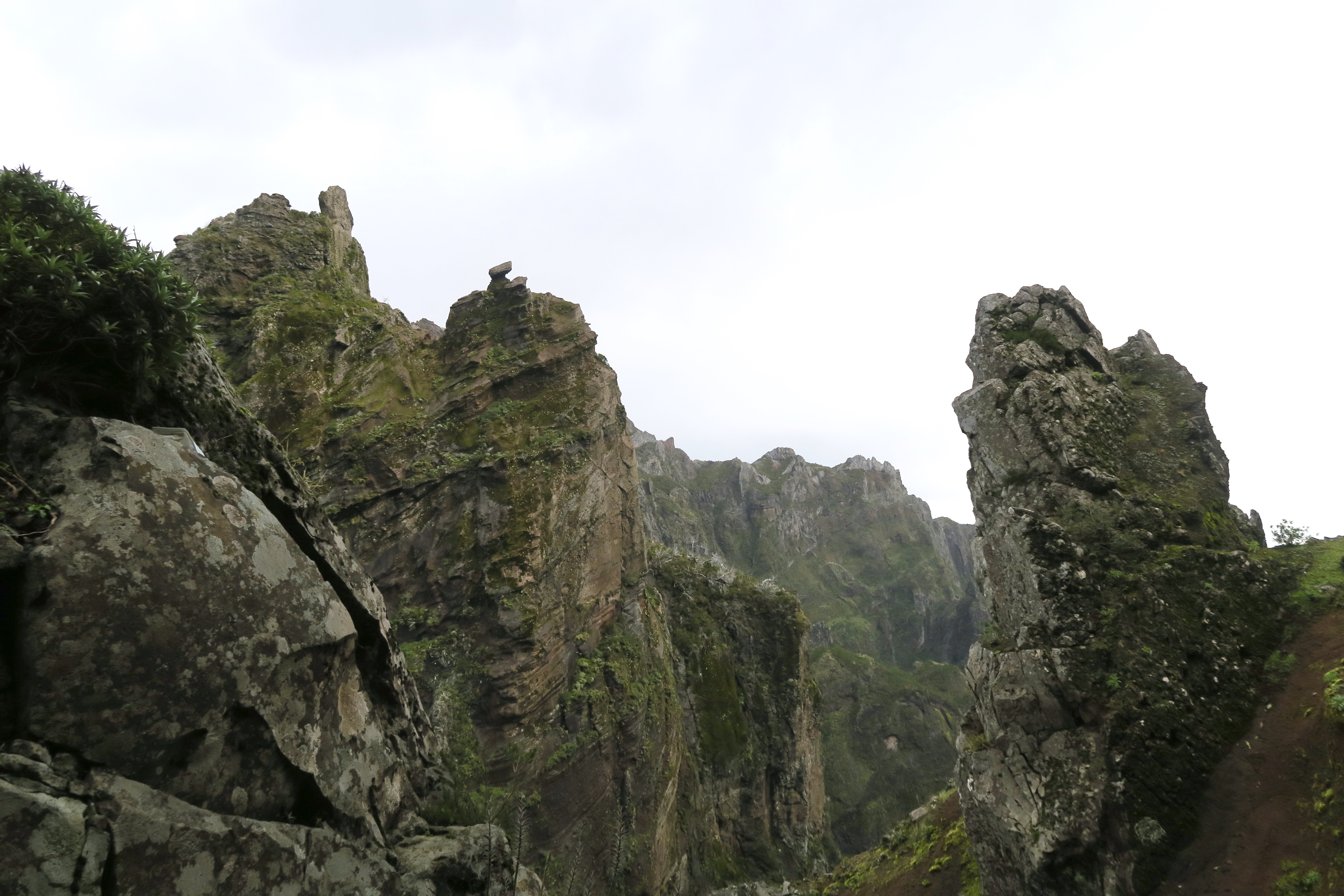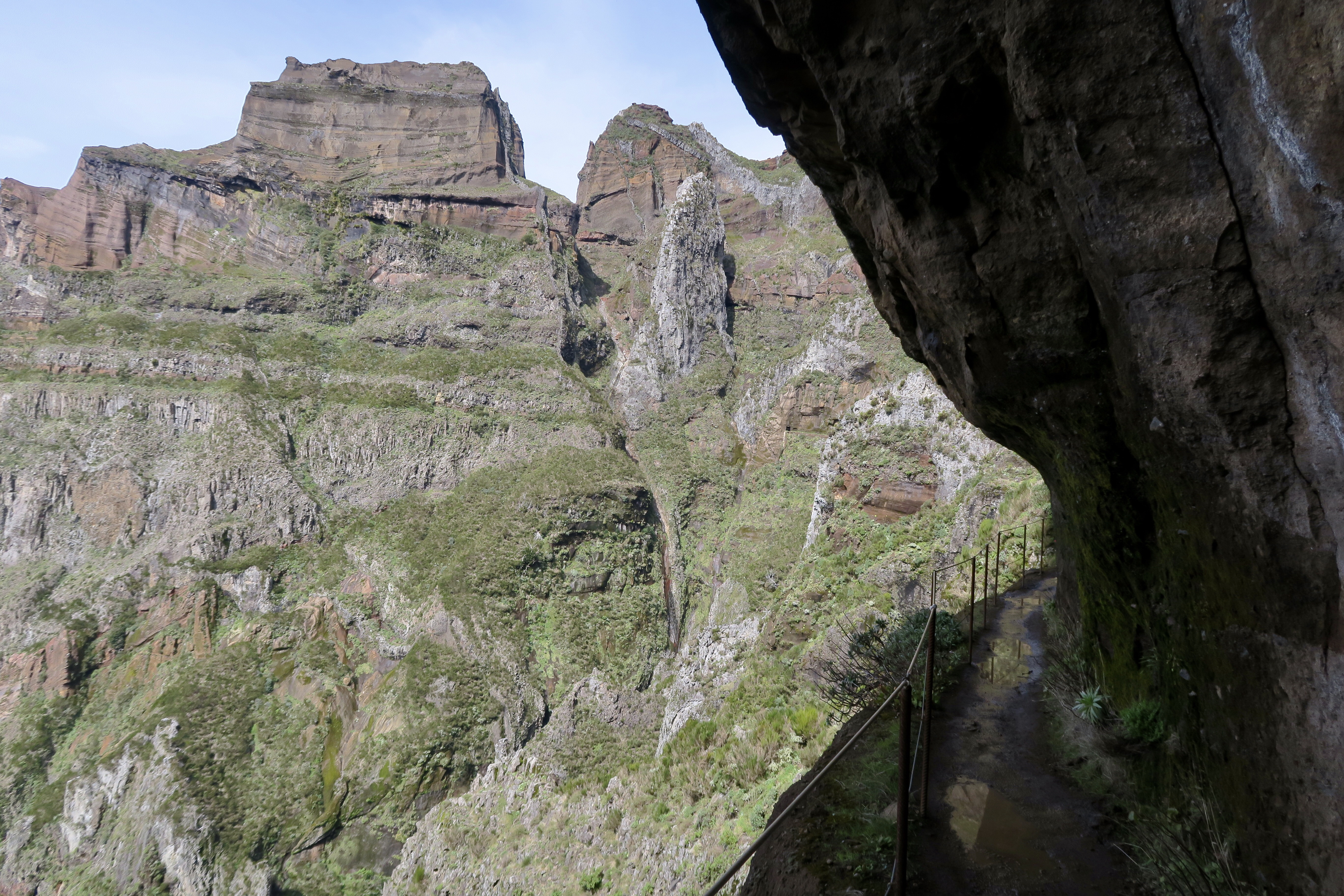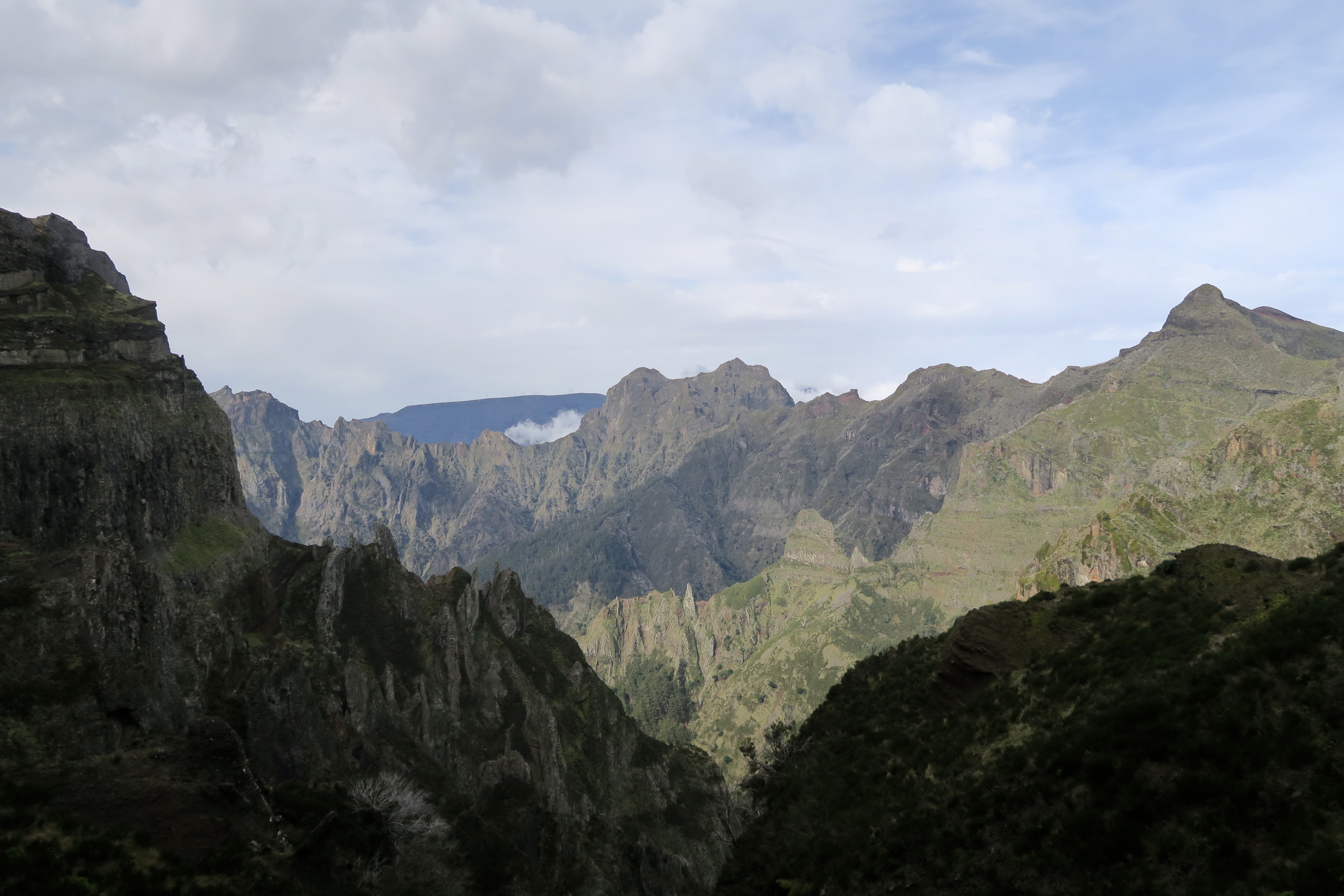 Je parlerai d’abord de ma plus belle randonnée et peut être aussi de la plus exigeante: c’est du Pico Ruivo, la plus haute montagne avec ses 1862 m au Pico Arriero 1818 m aller et retour, ce qui fait 6 heures de marche sans pause et surtout un dénivelé sans pareil, et j’ai fait 20 km dans la journée et 8 heures sur les jambes, mais quelle bonheur! Un paysage à couper le souffle, des montées raides, des escaliers en fer, des tunnels, des chemins abrupts et finalement beaucoup de monde. Au début je partais seule, je me suis même posée la question si je n’allais pas avertir quelqu’un en cas d’accident. Mais très vite, j’ai croisé du monde ( la plus part des gens font la rando à l’envers), et au moins je n’étais pas seule. Par moment le vent était si fort qu’il fallait se cramponner à ses bâtons, mais la grande chance était que ce jour là il a fait beau! Et voici quelques photos