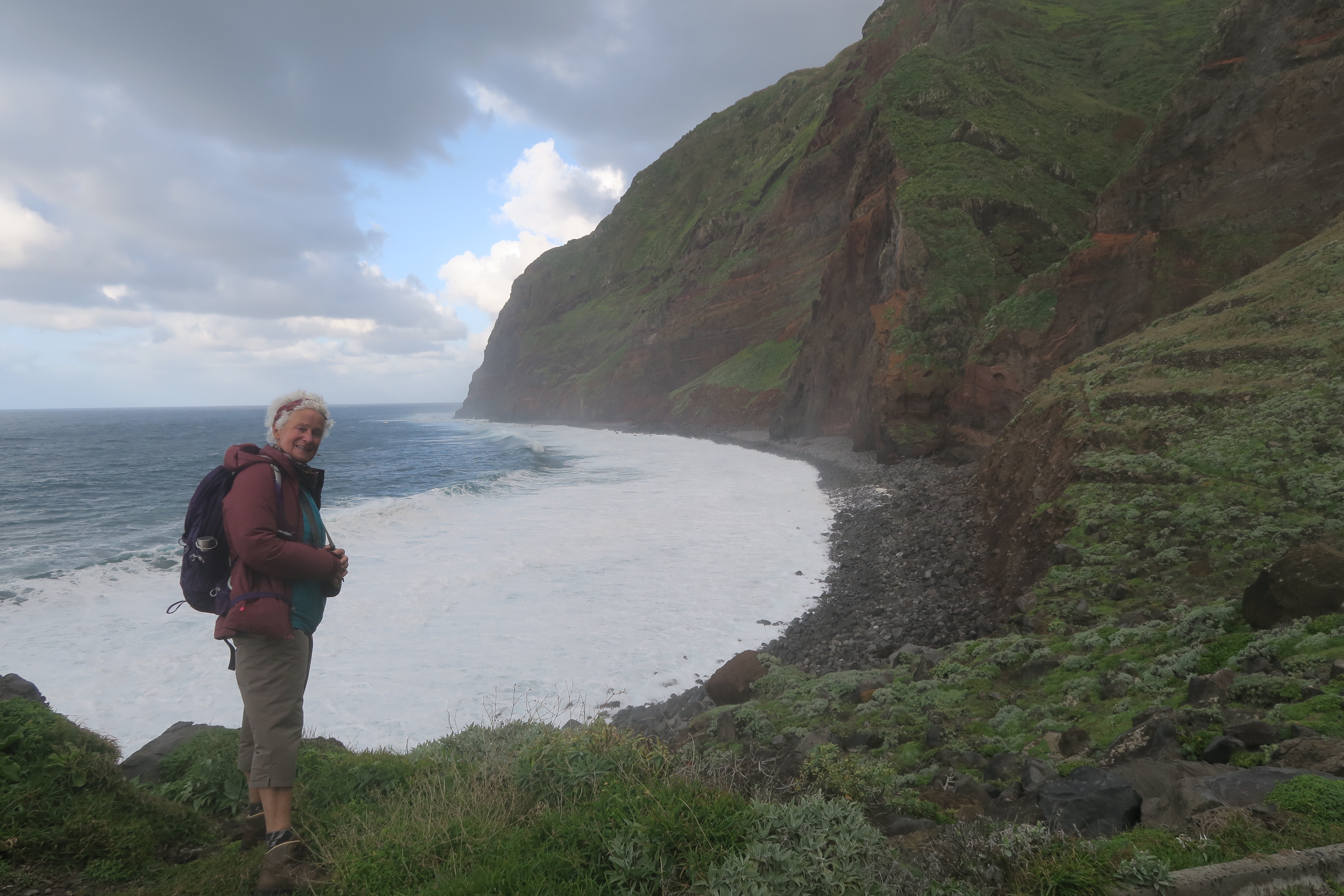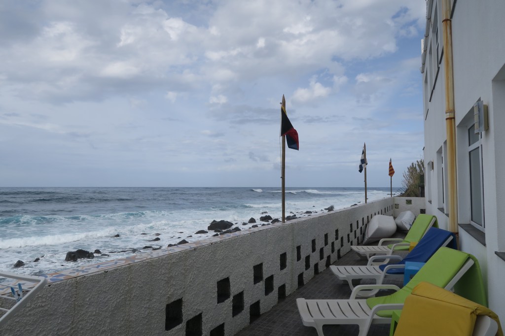 J’ai fait cette rando à partir de Santana, connu par ses petites maisons pointues en toit de chaume. Moi, j’avais choisi une petite pension très sympathiques la casa de Tilo, où je suis restée deux nuits. A mon départ, au petit déjeuner, j’entends parlé un français de ma prochaine destination: Saô Vicente. Ah, ça m’intéressèrent surtout des liaisons de bus sont très rares. Du culot, il en faut, et je demande de m’amener à ce petit village. Très sympathique, Thierry, et en plus nous faisons une belle rando ensemble avant qu’il m’amène devant mon prochain hostel : the Waves Hostel. Cela porte bien son nom, il est construit quasi au-dessus des vagues.