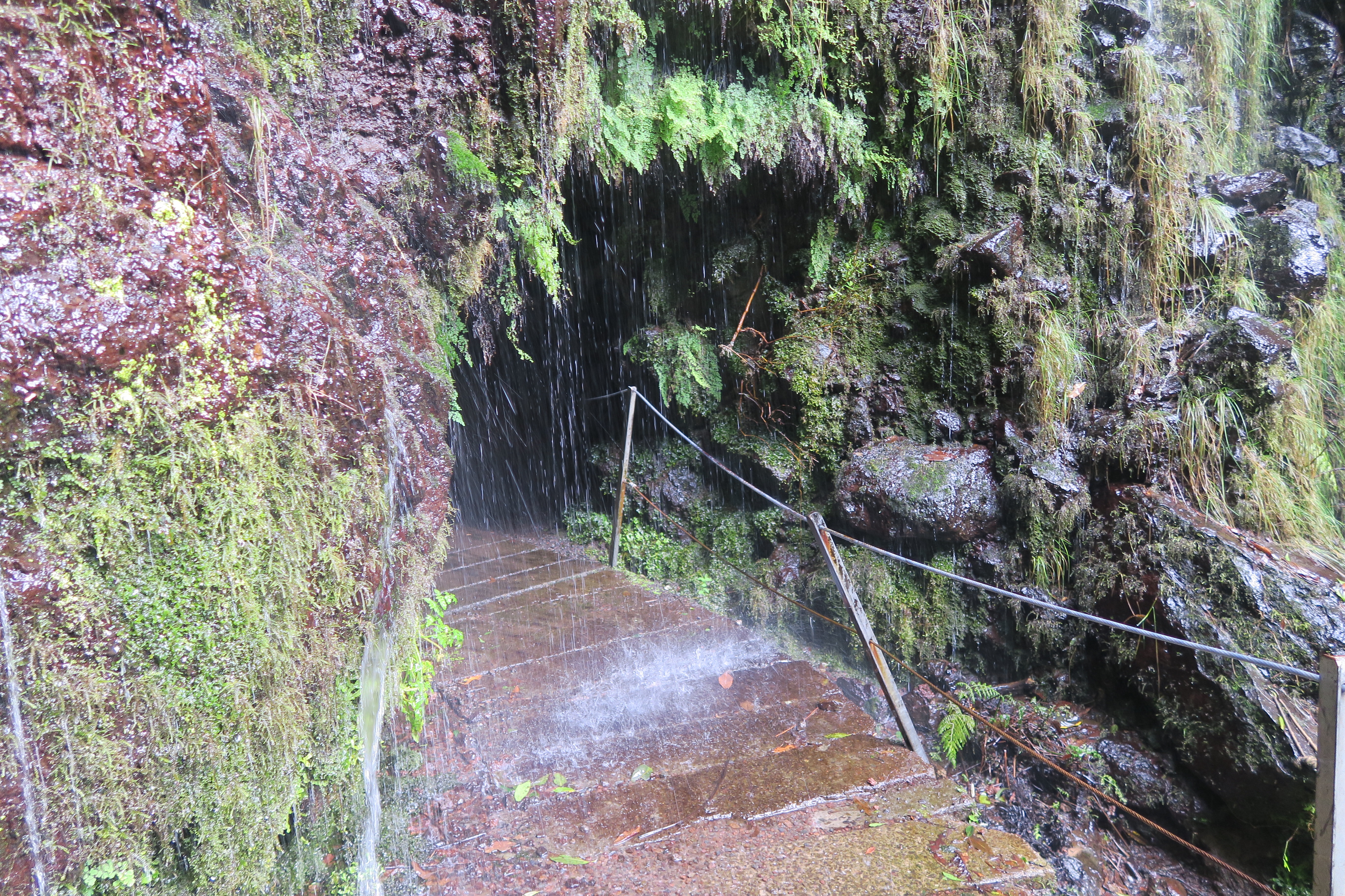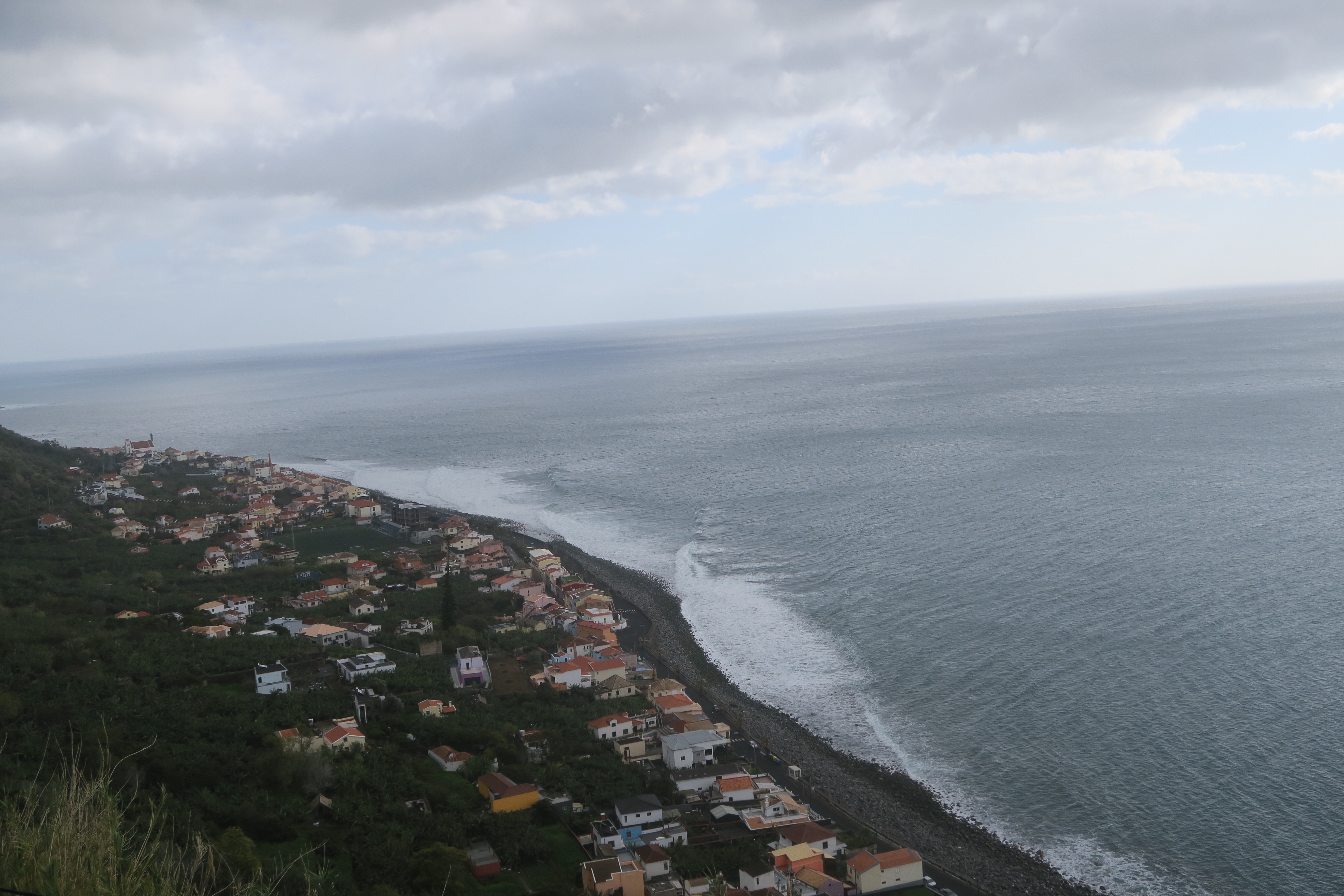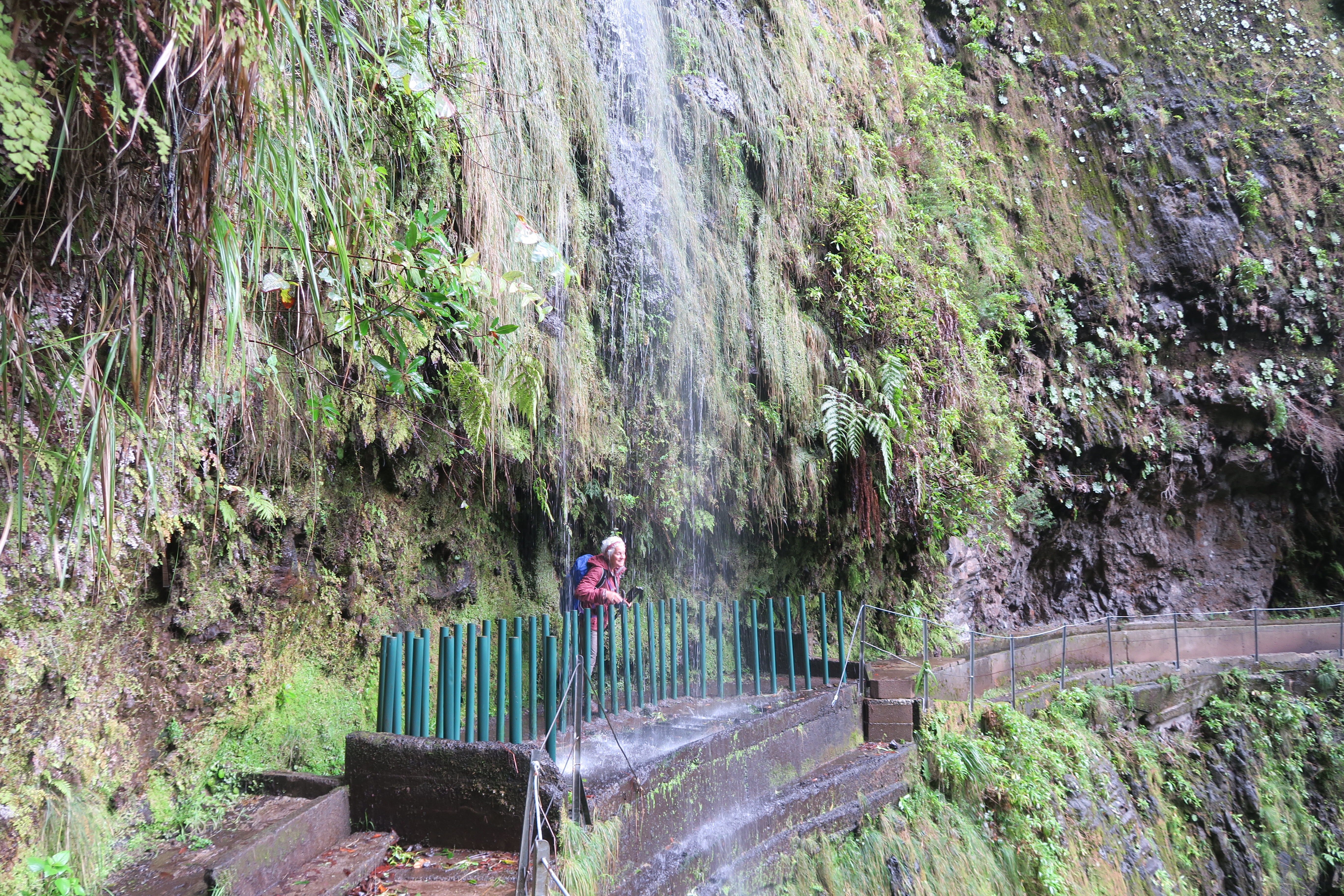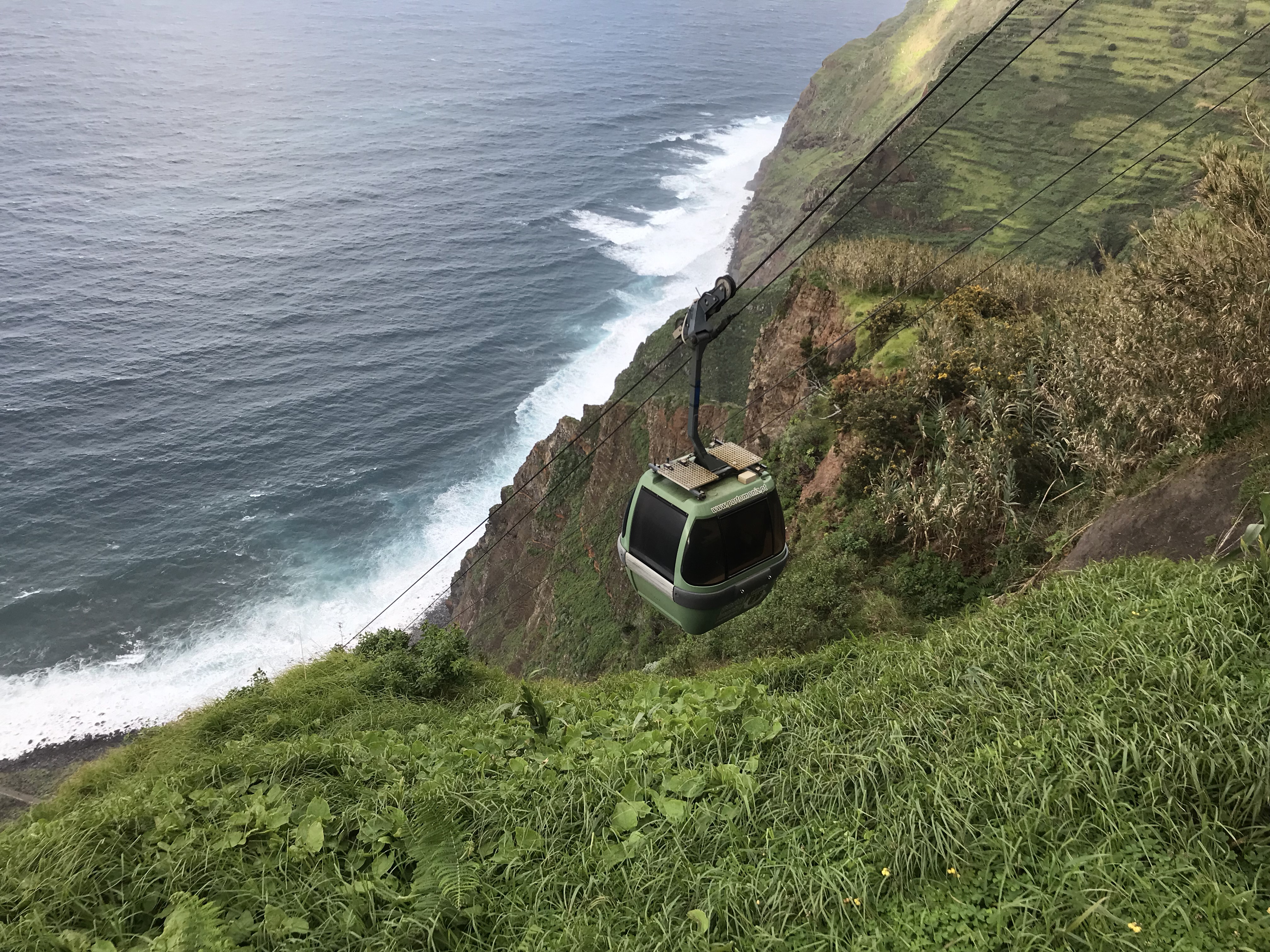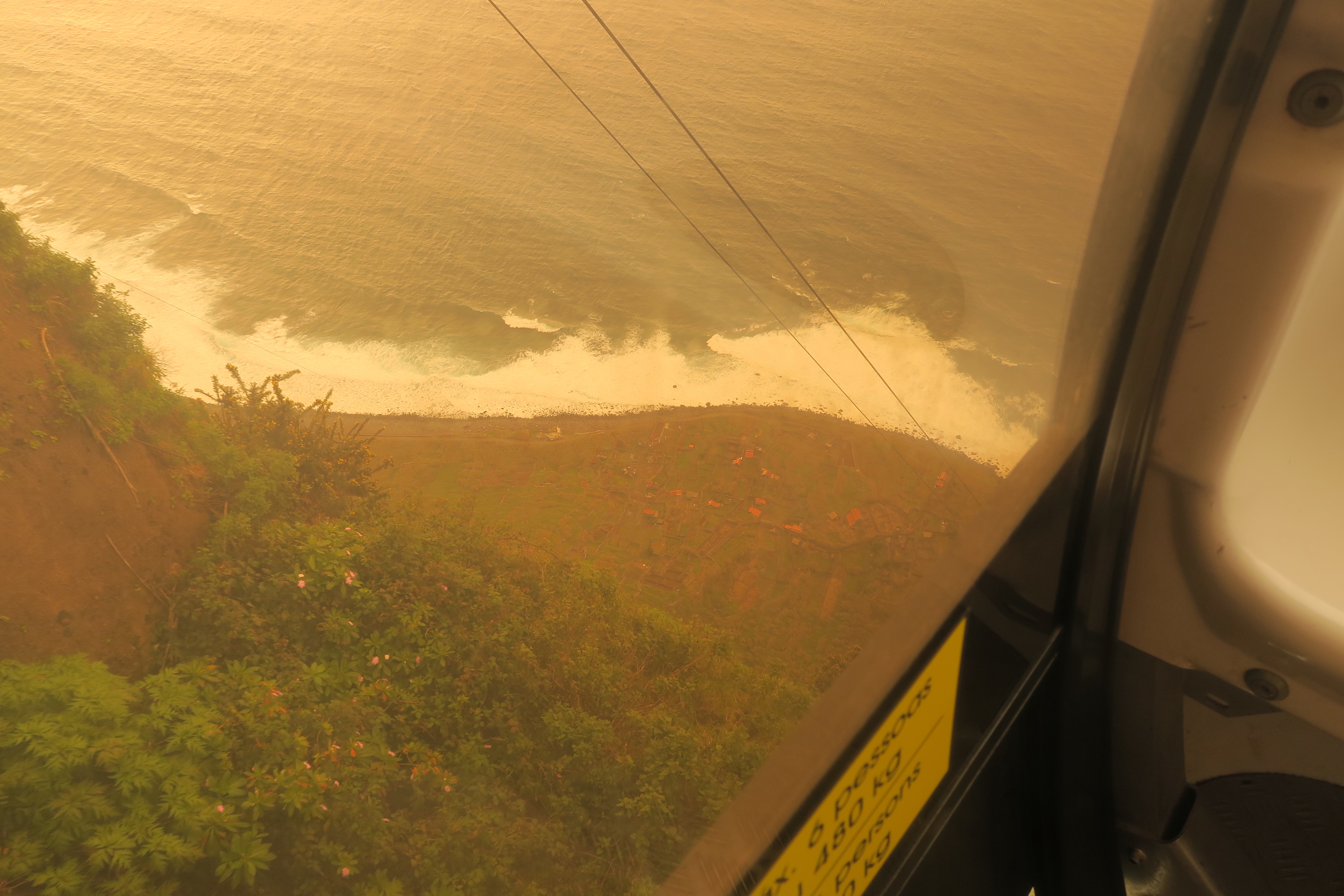 Cette île est tropicale et très vert….. et ça vient de quelques chose……. Oui, vous avez devinez: il pleut et en ce moment souvent. Les derniers jours jusqu’à dimanche (c’est aujourd’hui) il a fait un sale temps. Nous avons tenté en deux reprises de faire la fameuse Levada des 25 sources et à chaque fois c’était le déluge. Hier j’ai quand même passé une super journée en compagnie de deux suédoises et leur voiture, Linn et Fanny. Après la déception de ne pas faire les 25 sources nous avons visité le curieux village de Jardim do Mar, oasis en bas d’une énorme falaise et nous avons pris surtout un funiculaire, le plus raide de l’Europe, pour descendre vers les jardins. Toute seule je n’aurais pas osé, mais à 3 c’était marrant.