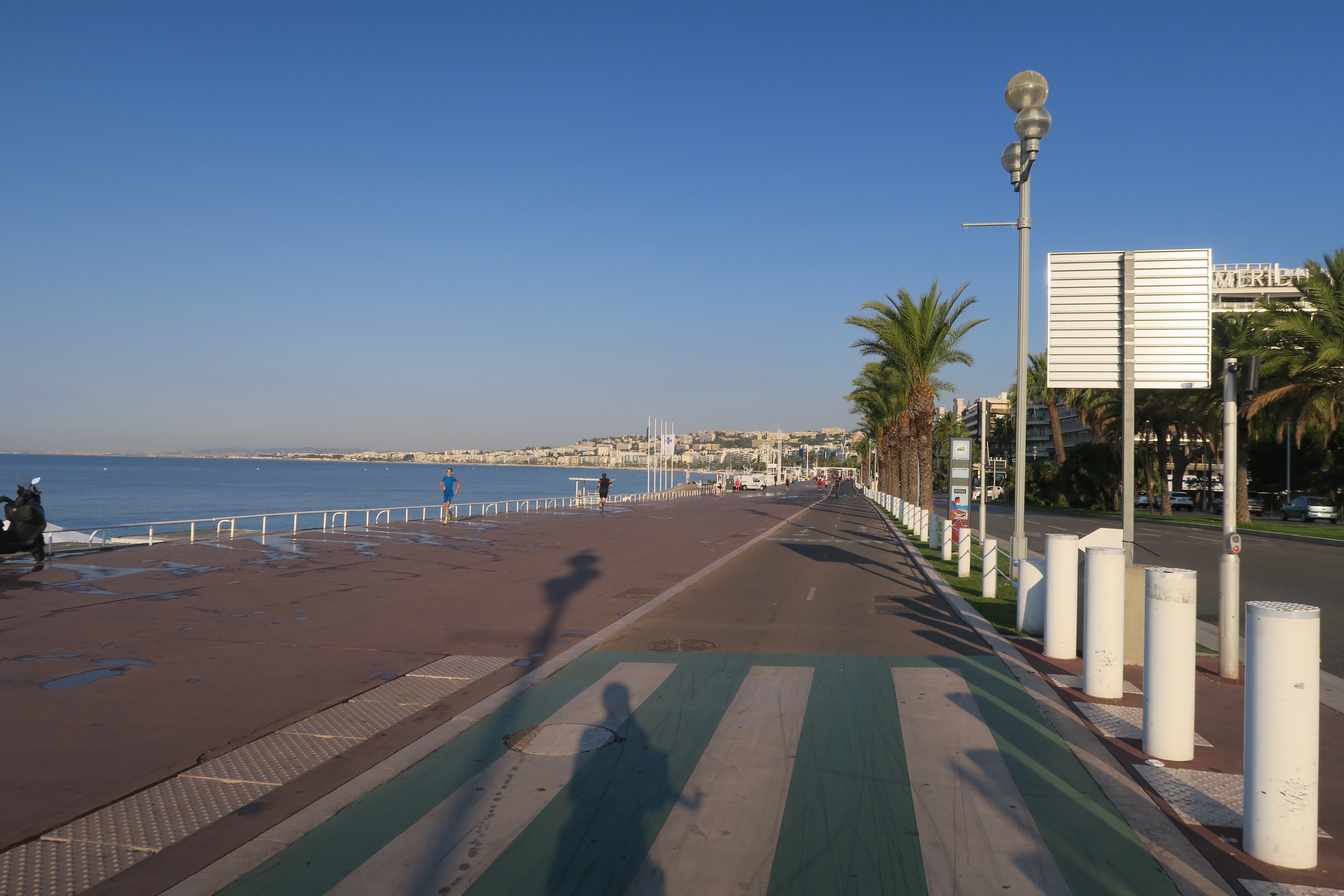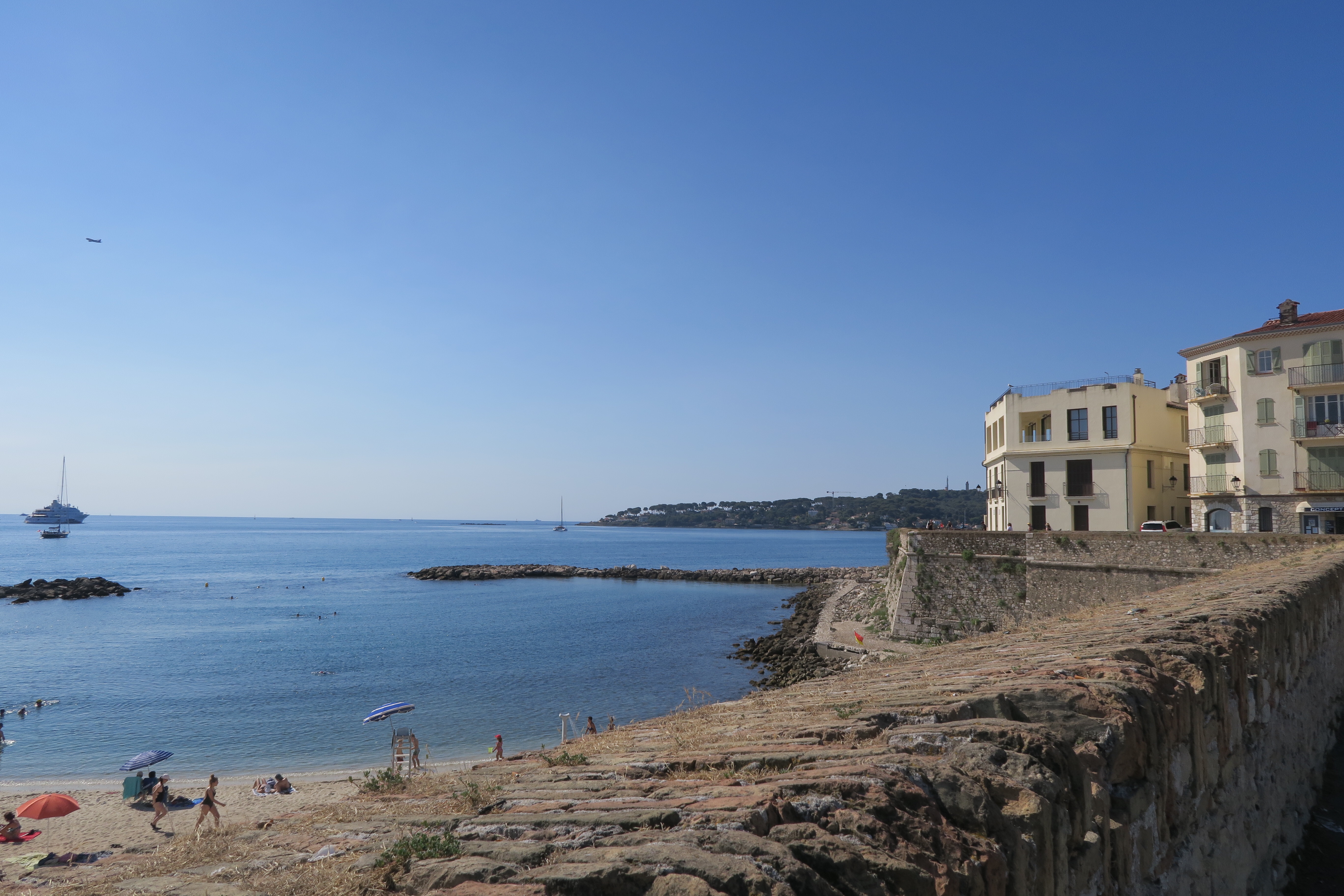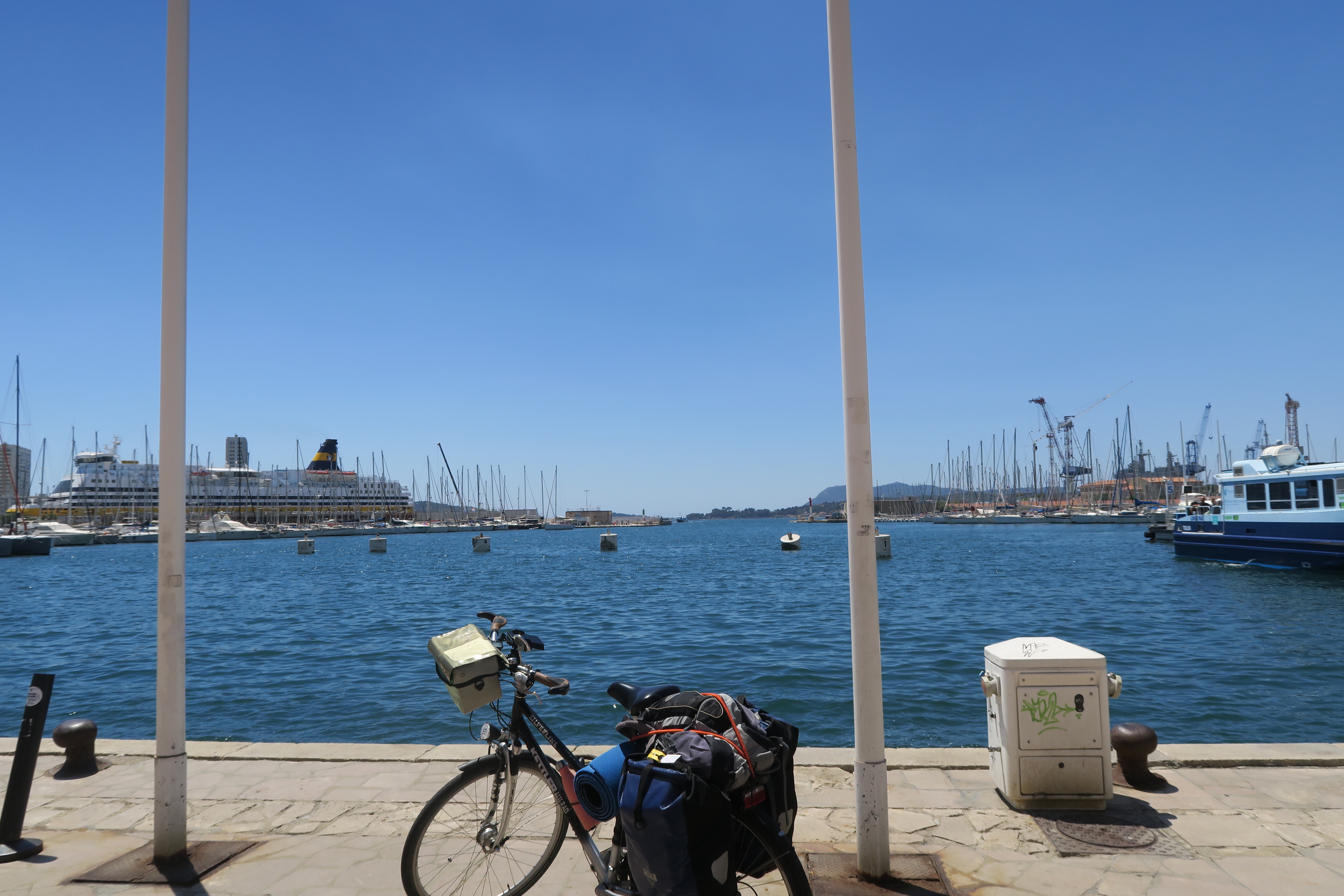 C’est pas folichonne, comme dit l’autre, certes il y a une piste cyclable qui longe la mer, mais l’autoroute et le train ça longe aussi la mer. Mais la vue sur la grande bleu est belle et la petite halte à Antibes me fait sentir, que je suis bien sûr la Côte d’Azur. Le prix des fruits et légumes sur le marché sont au moins le double, et ça grouille de touristes. Quelques petites rues sont pourtant désertes.