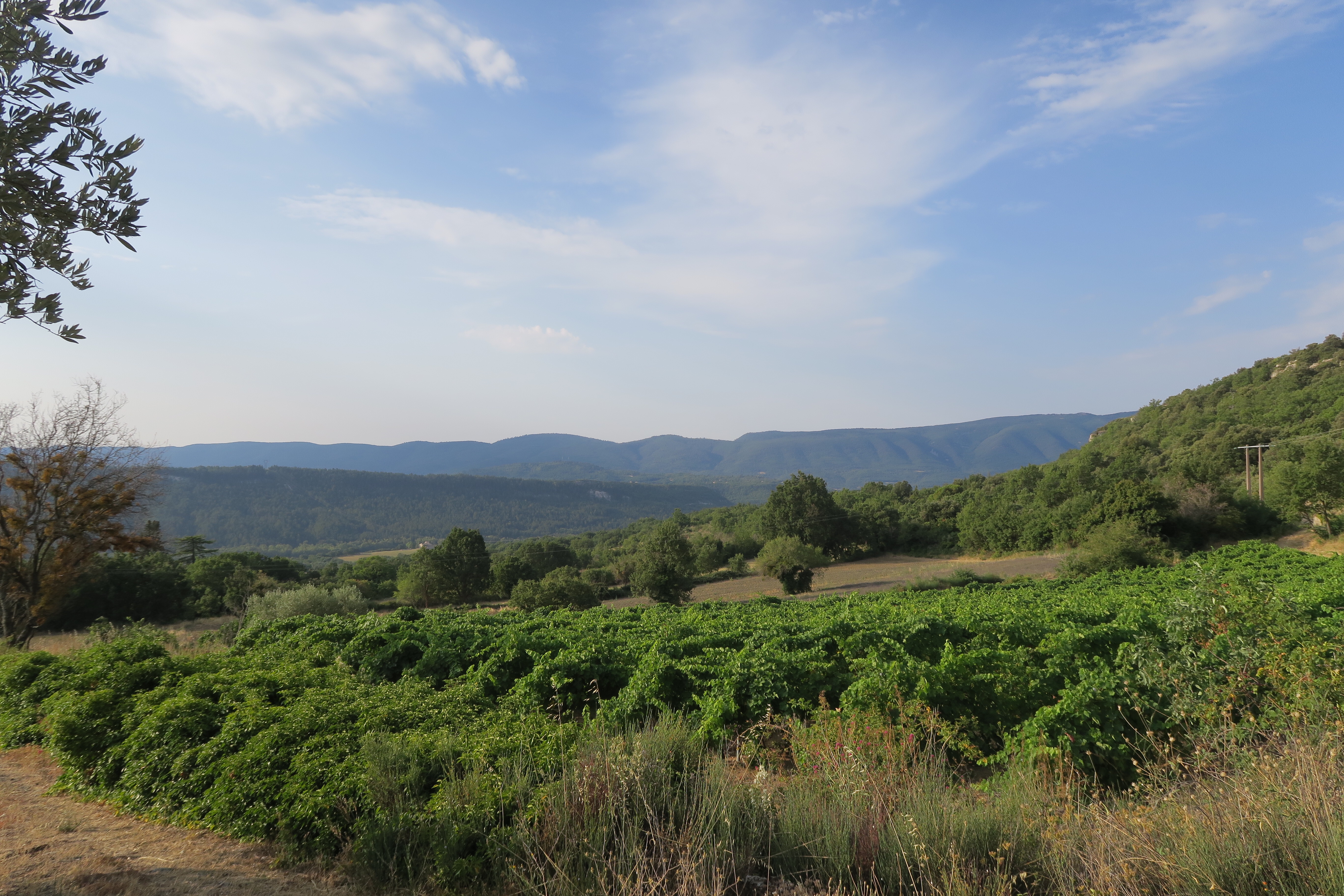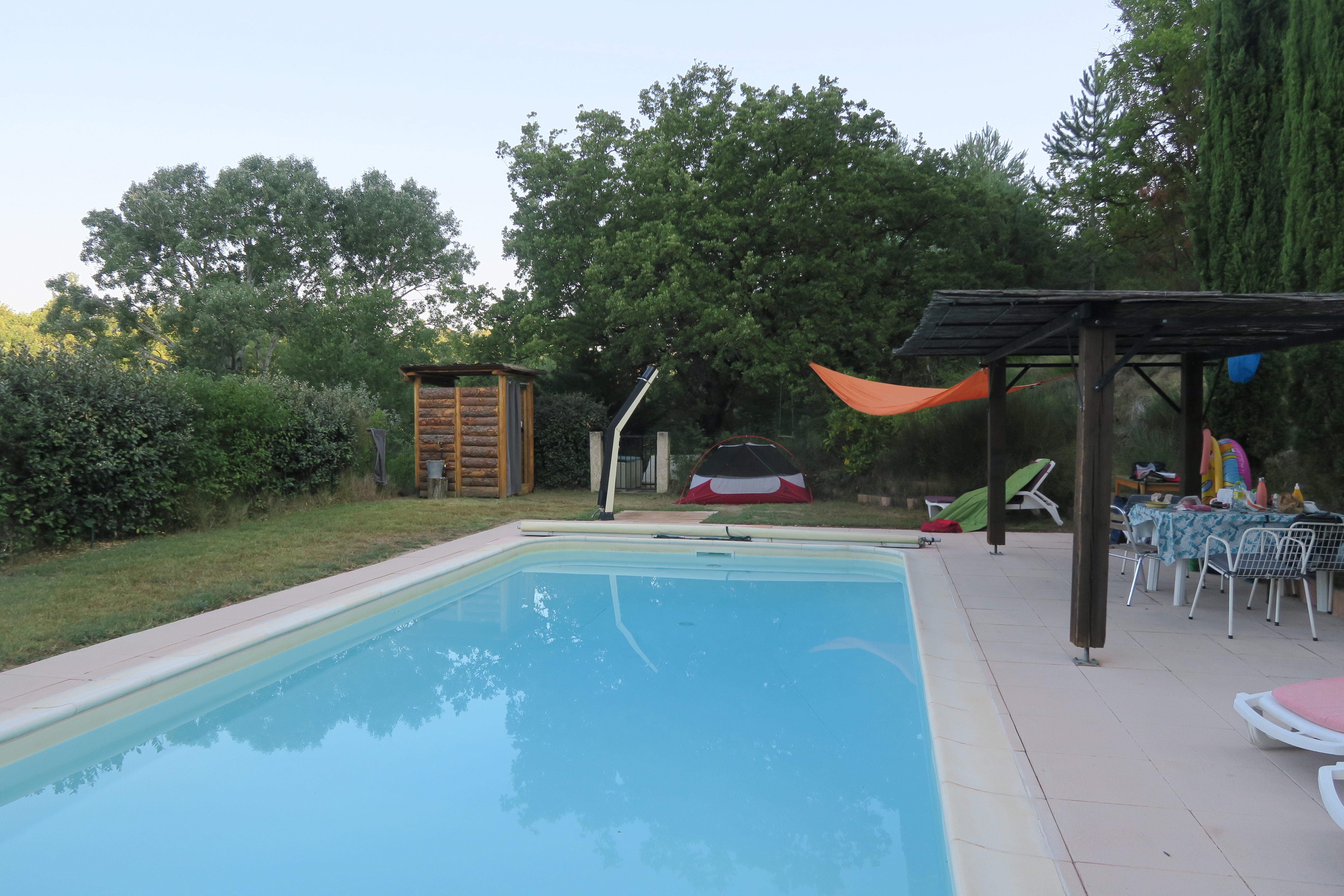 c’est une belle devise pour mon tour de vélo en pays de Méditerranée. Il fait chaud, tout le monde le sait, mais ma route est aussi très vallonnée et les villages sont souvent haut perchés. Donc, j’adapte mon rythme et mes activités aux conditions et à l’air ambiante. Cette année, je ne compte pas les km, les sous n’ont plus, je vis au jour du jour, je suis mes envies du moment et côté hébergement je trouve des bons plans. Par exemple grâce à « homecamper » je profite des piscines chez des particuliers tous très sympathiques. C’est mieux que de planter ma tente entre caravanes et mobile-home. Le gîte d’étape (à Céreste) n’est pas mal non plus, je dors dans un vrai lit, je peux me faire à manger, je reste plusieurs jours dans le même endroit et je sillonne autour.