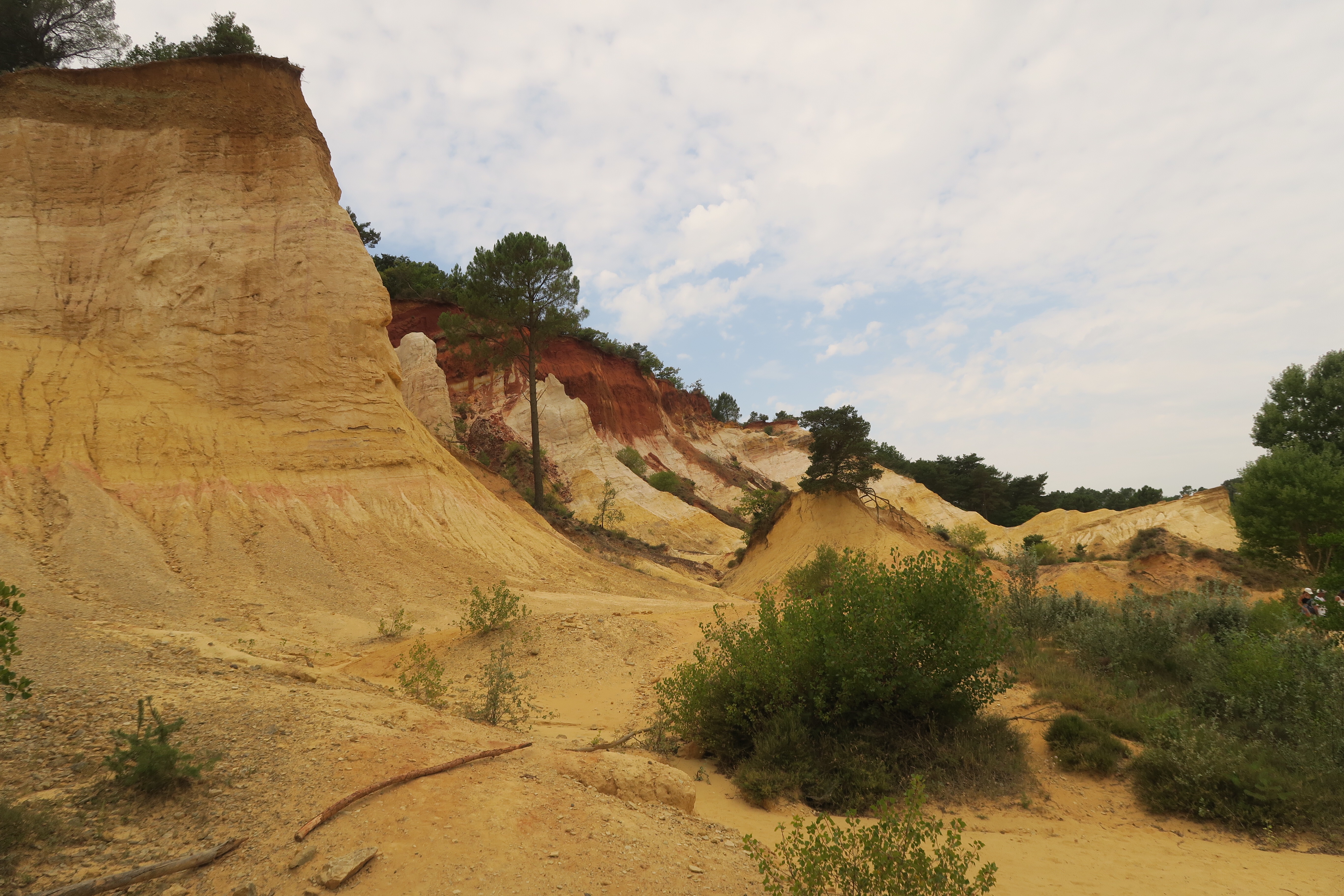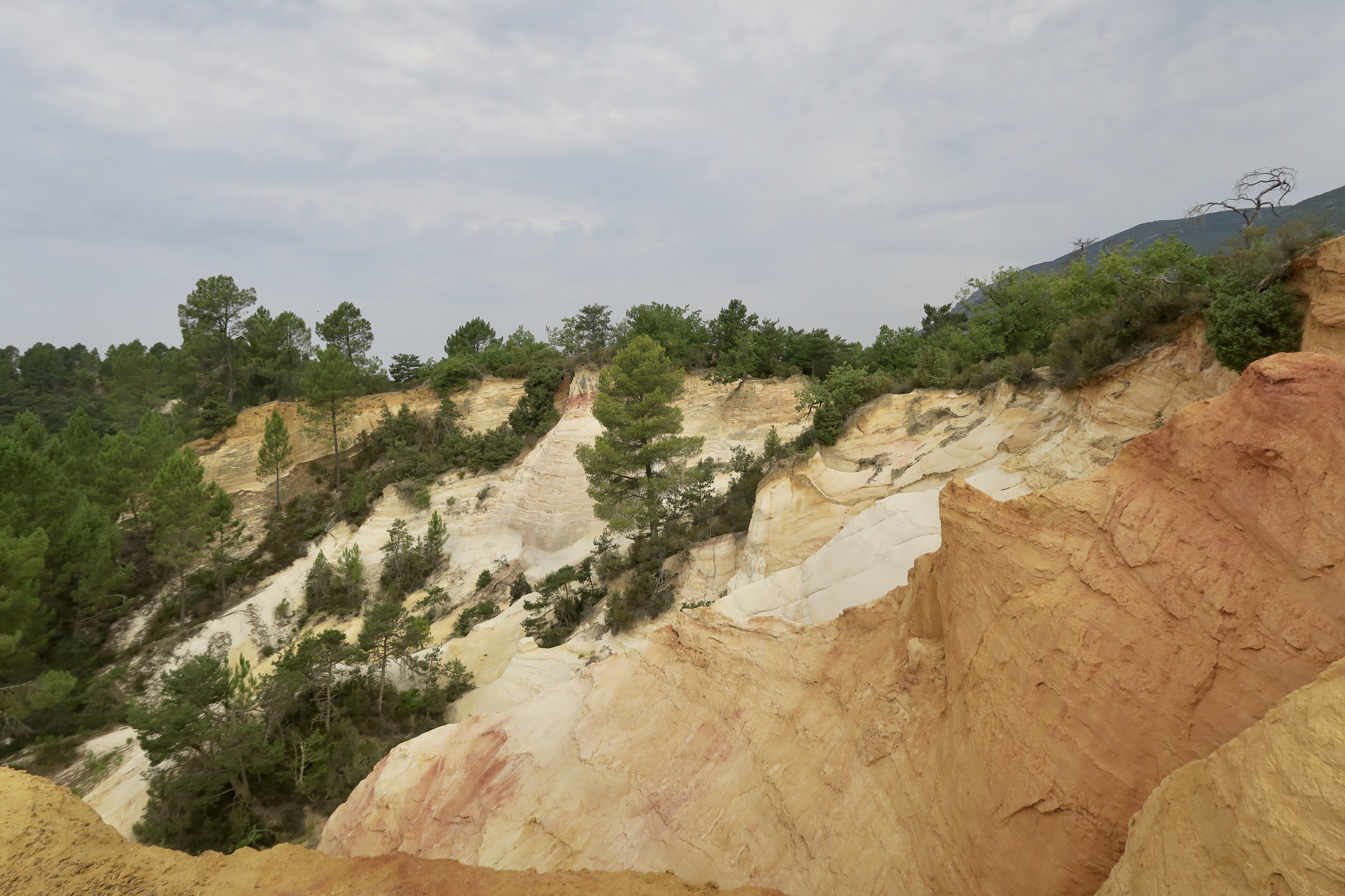 C’est d’ici que je pars très tôt le matin vers le Colorado de Rustrel. En montant, dans la fraîcheur du matin, je plonge dans un bains de parfum intense, rarement senti à ce point. Après deux heures de montée je suis gratifiée par un bain de couleurs flamboyantes passant du blanc, jaune, ocre, rouge, marron, même du violet, c’est une ancienne mine, appelée « Colorado de Rustrel ». Je finirai une pellicule de photos, si cela existait encore.
