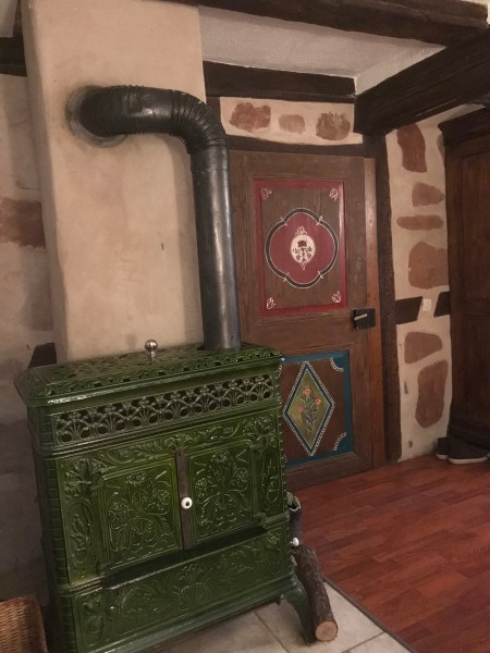 Ma montagne suivante ce sont des Vosges. C’est grâce à Monique, ma bonne copine de Strasbourg, que nous découvrons à quelques kilomètres de Strasbourg dans le parc des Hautes-vosges une chambre d’Hôtes dans une maison vieille de 300 ans. C’est tout ce que j’aime: l’ambiance ancienne de cette maison typique des Vosges, un mobilier rustique et un poêle en faïence, que j’entretiens en expert. N’oublions pas le petit déjeuner succulent avec confiture maison et Gugelhupfe. Ici aussi des balades sont au programme, et on ne se laisse pas décourager par le mauvais temps et le soleil perce toujours par moment. Encore un super restau nous console des gouttes de pluie ( le Bois Flotté a Weinbourg) et une autre fois ce même restau nous remonte le moral gustatif après une flammekueche dans une auberge hideux a Buxwiller. A« La petite Pierre », lieu le plus connu dans les hautes Vosges, nous deouvrons une des fameux rochers de la région, mais il commence vraiment à faire froid.