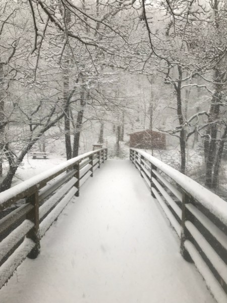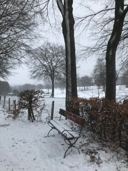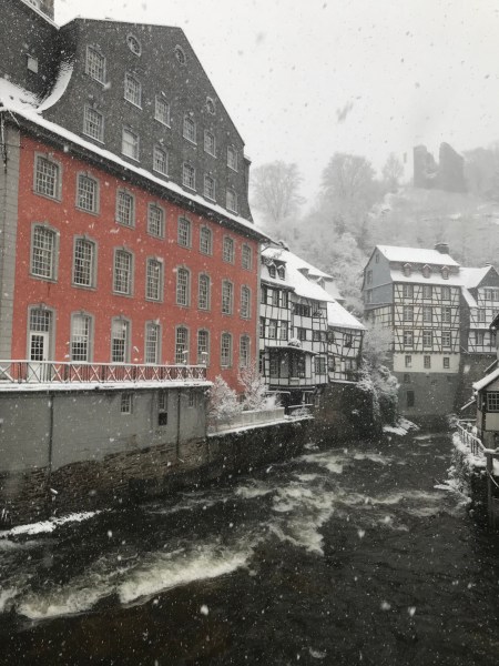 Le vendredi 20 janvier, je suis partie en bus pour conclure mon périple des « moyennes montagnes », die Eifel. Aix La Chapelle est dans un creux et les montagnes proches sont « die Eifel ». On monte vers cette très jolie région par une route qui s’appelle Himmelsleiter, ce qui veut dire: échelle pour le ciel et aujourd’hui, il y a plein de neige. Arrivée juste avant Monschau ( Mont-joie en français) je pars pour ma rando de 4 heures. Et il neige, il neige, bientôt mes pieds foulent 30 à 40 cm de neige fraîche. Le paysage est féerique et je suis toute seule, avec mon GPS et ma bonne humeur. Ma boucle se finit à Monschau dans un salon de thé. Et là, j’entends par des clients que toutes les routes sont complètement fermées, plus rien ne passe, plus de moyen de circuler ni revenir à Aachen, sauf à pied, et ça fait 35 km. Bon, il y a toujours une solution, c’est ma devise. L’auberge de jeunesse pourrait m’héberger, mais la copine d’Elisabeth, du groupe de danse de ventre, ( je suis allée à une répétions juste avant ) veut bien m’accueillir, il faut juste encore une heure de marche pour y arriver. Quel bel accueil et finalement je passe la nuit, je dirais 4 étoiles.
