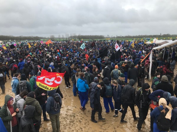 Arrivée tout proche de ce « grand trou» ( pas de bâches, la bassine est en construction ) alors une mega-police est déjà sur place : 3000 policiers avec des grenades lacrymogènes et des grenades de désencerclement ( en Europe, seules les forces françaises l’utilisent. Ils n’ont pas tardé à lancés ces grenades : 4000 dans 2 heures, ça fait 33 par minute. D’après les gens et des journalistes qui étaient devant, la violence policière étaient énorme et ils ont empêché les secours de s’approcher et d’évacuer les nombreux blessés. Coté policiers, 2 ou 3 camions ont brûlés et il y a eu aussi des blessés. Des policiers sur des quads, engins de guerre, ont encerclé les gens et deux entre eux ont tiré des LBD, ce sont des balles de défense très dangereuses. Voir aussi le rapport des observateurs, dont la Ligue des Droit de l’homme, c’est accablant !