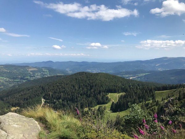 Le lendemain on change de décors, on descend la plaine d’Alsace, de loin on voit les charmants villages adossés sur les collines et le Haut Koenigsbourg. Nous passons à Munster et peu après nous montons sur les hauteurs des Vosges, à la ferme auberge du Tanet. Ah, qu’on mange bien ici ! La montée sur les crêtes nous fait bien digérer.