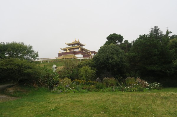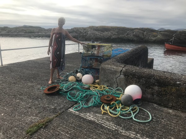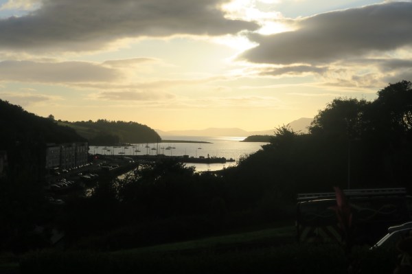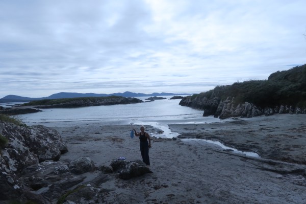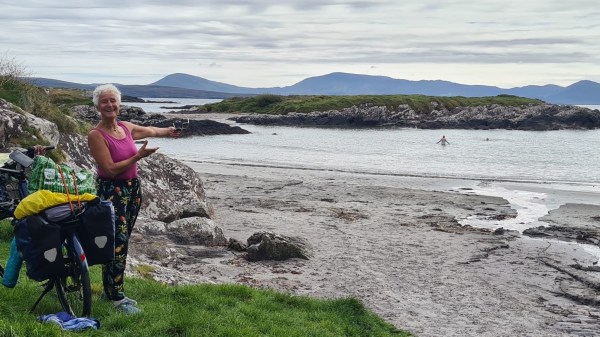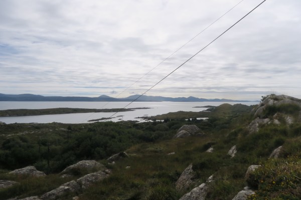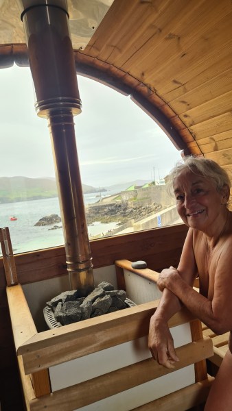 Sur le Ring of Kerry, ce week-end, se passe un grand tour de vélo: 4000 cyclistes vont parcourir entre 90 et 140 km…. On les croisent partout, raisons pour nous de laisser nos vélos et de faire un tour en stop et à pied. Au grès des rencontres, notre journée se décide: d’abord un bon bain de mer et un sauna, c’est génial. Ensuite nous mangeons un fish and chips devant l’île qui est reliée avec un téléphérique, unique en Irlande. Une autre conductrice nous amène au tout nouveau Centre Buddhist, et retour à notre campsite avec chambre.