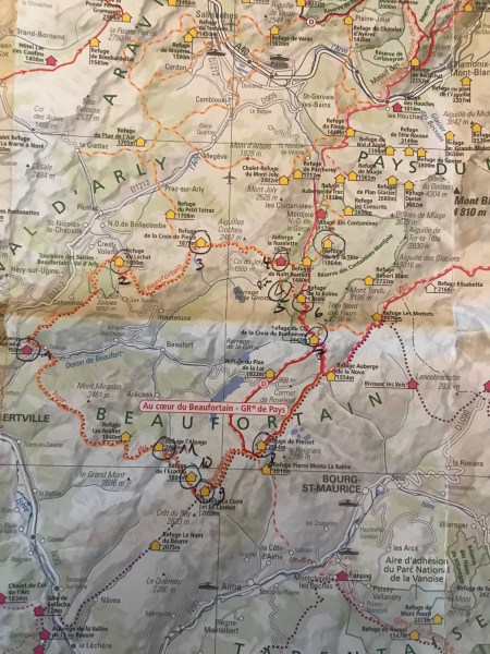 Voici notre tour: ça commence à gauche avec le gîte d’étape près de Quiege, dans le sens d’une aiguille d’une montre: 2. Refuge de Lachat, 3.Refuge de La Croix de Pierre, 4. Refuge de la Roselette, 5. Refuge de la Balme et juste à côté 6. Refuge du Près ( pas encore sur la carte,car neuf), 7. Refuge du col de Bonhomme. 8. Refuge de Presset, 9. Refuge de la Croire, 10. Refuge de l’Econdu, 11. Refuge de l’Alpage. Dans beaucoup de refuges nous avions vue sur le Mont Blanc ! Nous avons terminé notre randonné à Arreches-Beaufort, dans un petit hôtel et, cerise sur le gâteau : une séance de sauna, hammam et jacuzzi. Le bonheur !