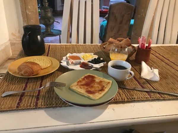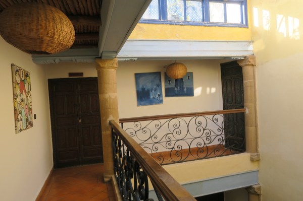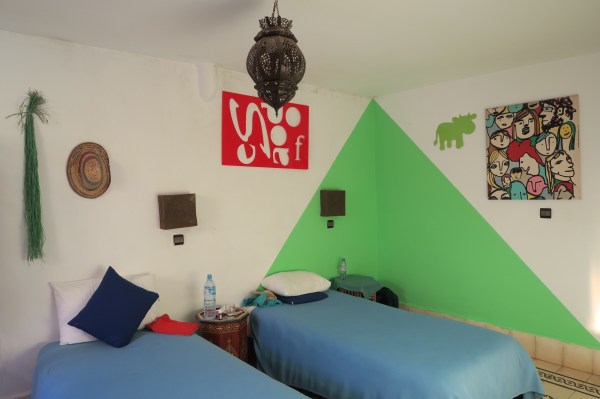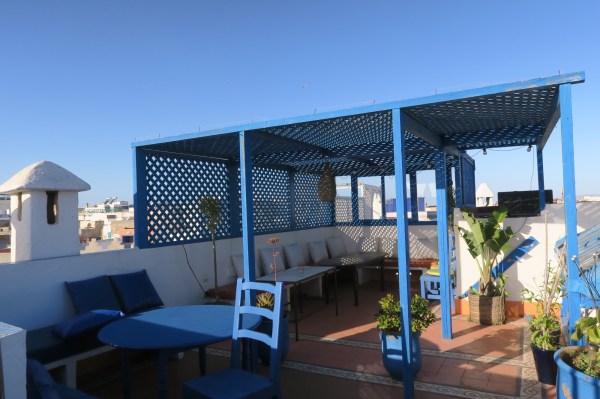 Mon « riad du vent », tenu par une Française, est situé juste derrière la grande enceinte, qui entoure la Médina. De l’extérieur, cela ne paye pas de mine, mais à l’intérieur c’est une architecture typique d’un Riad : sur 3 étages les chambres sont réparties autour d’un patio avec comme un point de i la terrasse sur le toit. La décoration est jolie et l’ambiance très amicale, je discute avec plein de gens de tout horizons.